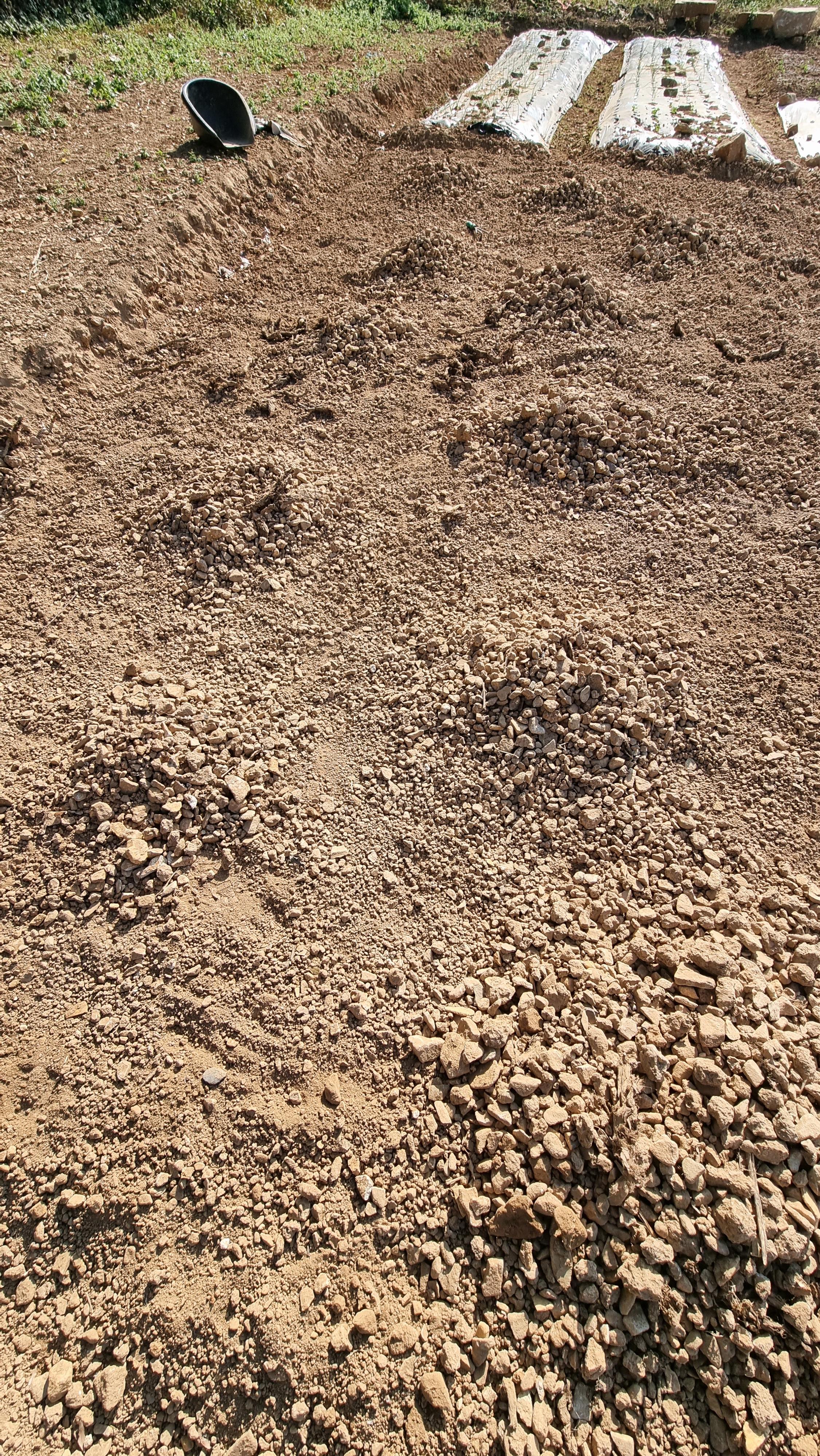 - 서까래 연마 작업을 중단 하고는 밭에 또 잔돌 골라 내기를 했고, 잔돌들은 집 안으로 가져와 만들고 있는 창고 바닥에 깔았다. 조금 더 깔고나서 시멘트로 마무리를 할지, 아니면 또 다른 방법이 나올지 모르겠다.