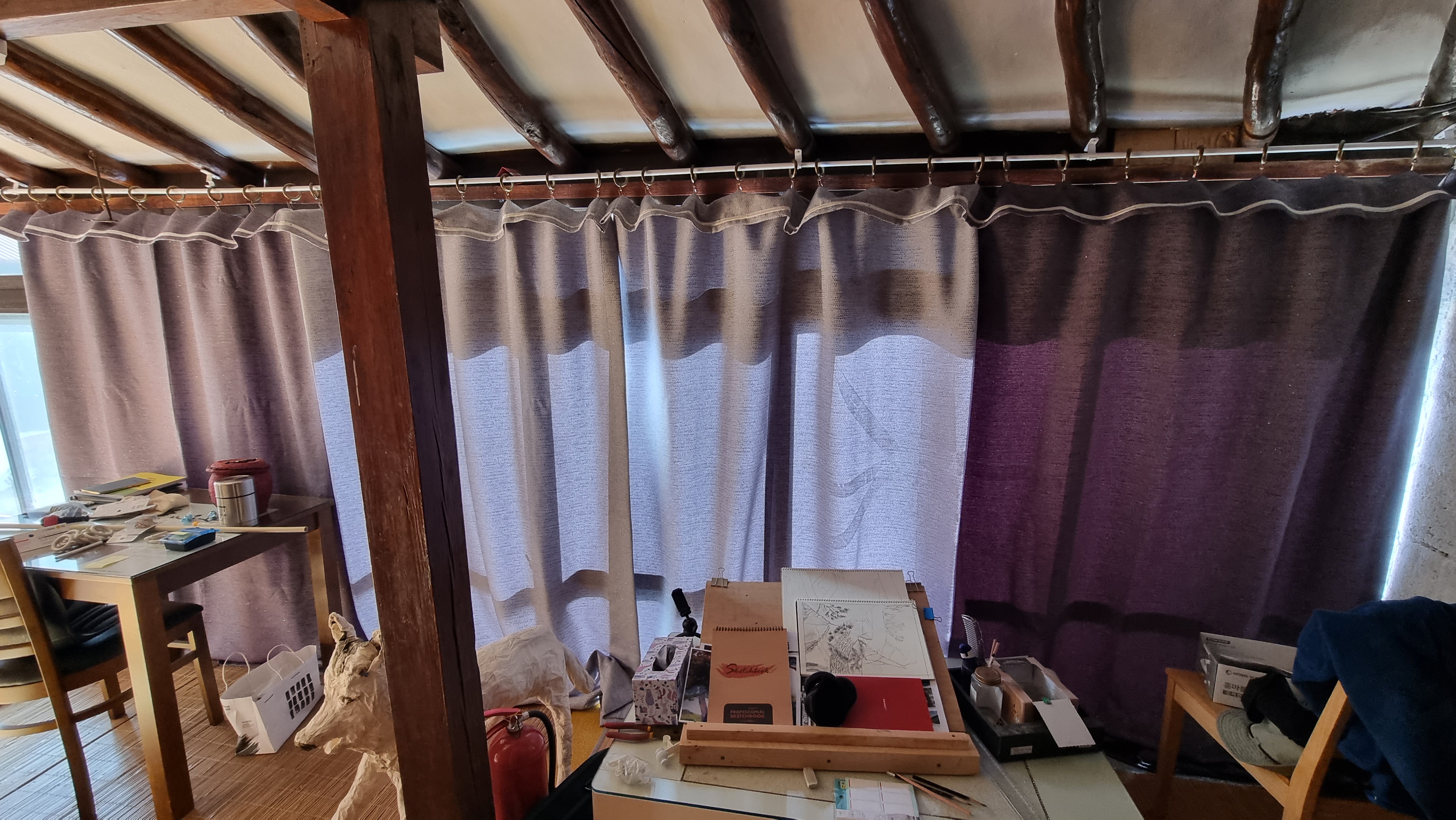 - 집에 와서는 방안에 가득 내려 앉은 먼지들을 쓸어 내며 청소기를 몇 번이나 돌렸다. 이제 니스칠과 페인트 칠이 남았는데, 천장과 대들보까지는 이렇게 하고 그 아래 쪽은 벽지로 마감을 할 생각이다. 대청소도 했다. 비닐 커텐을 치고 했지만 분진이 온 집안에 자욱하다. 어쨌던 큰 작업을 하나를 마쳤다. 방을 수리하는데 가장 힘든 작업인 셈이다.