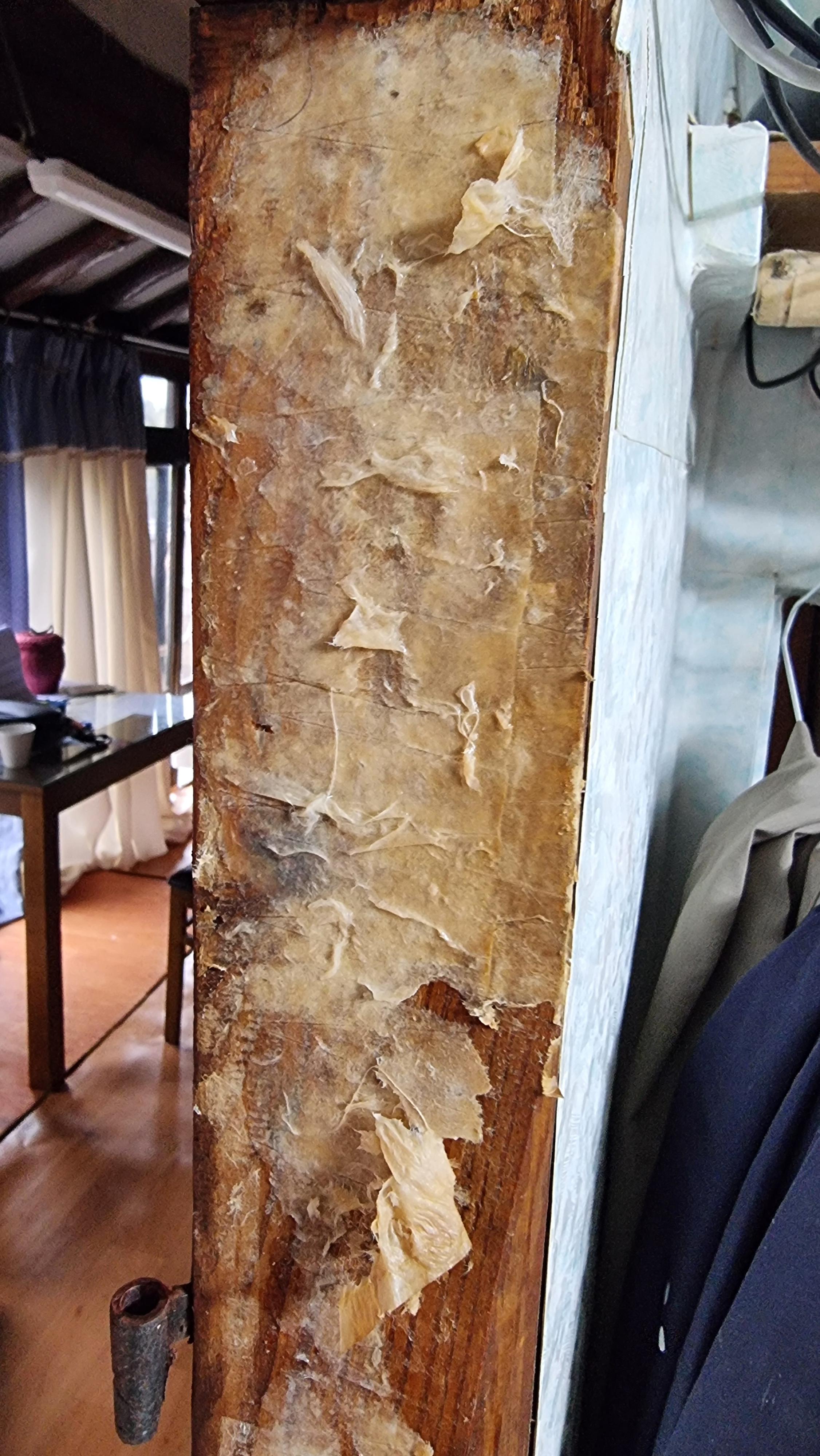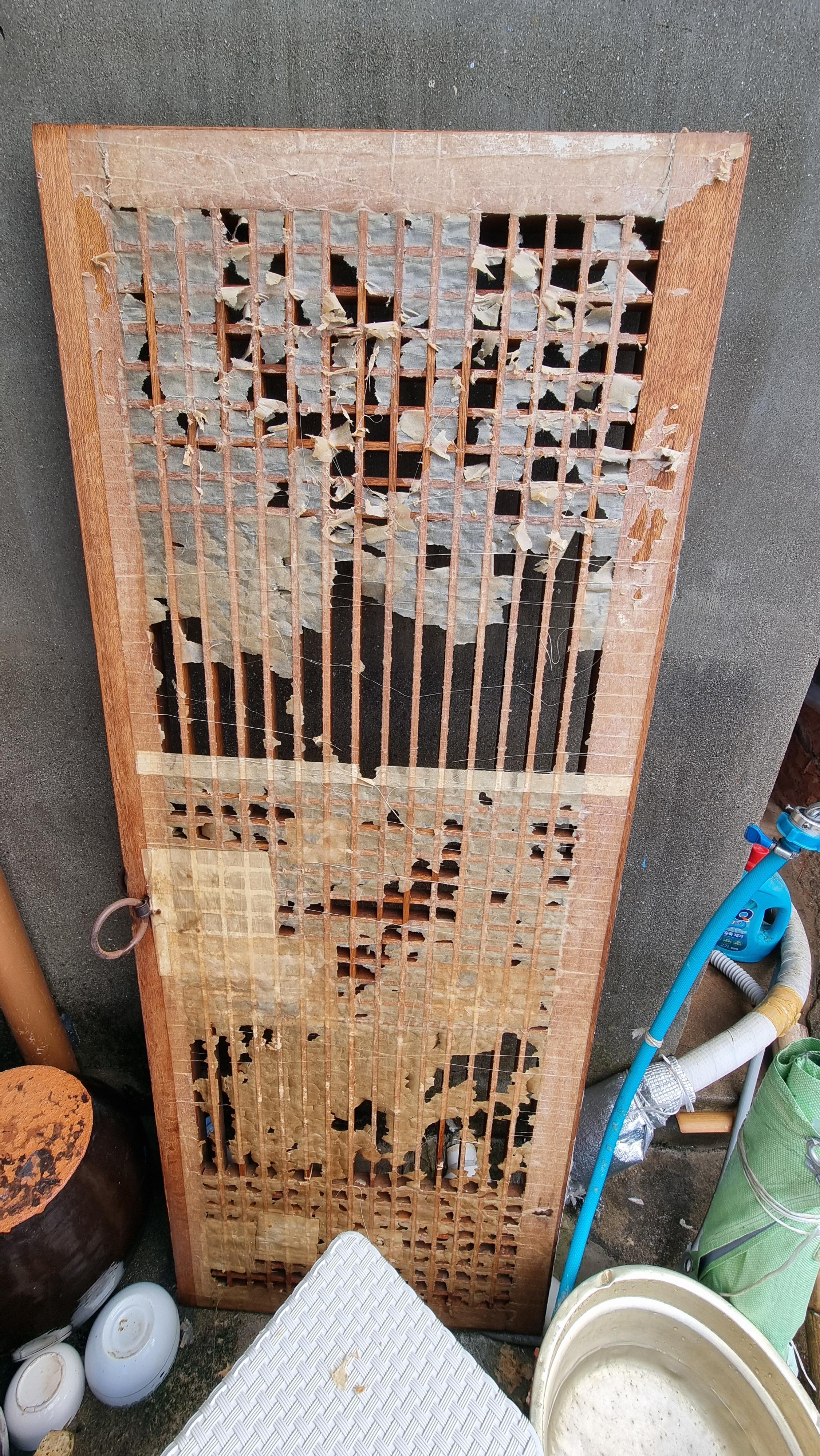 - 나는 오늘 두 개의 문짝을 떼어 씻었는데, 완전하게 씻은 것은 아니고, 하나는 1차 완성, 다른 하나는 종이만 떼낸 상태다. 작업은 이렇게 이루어진다.