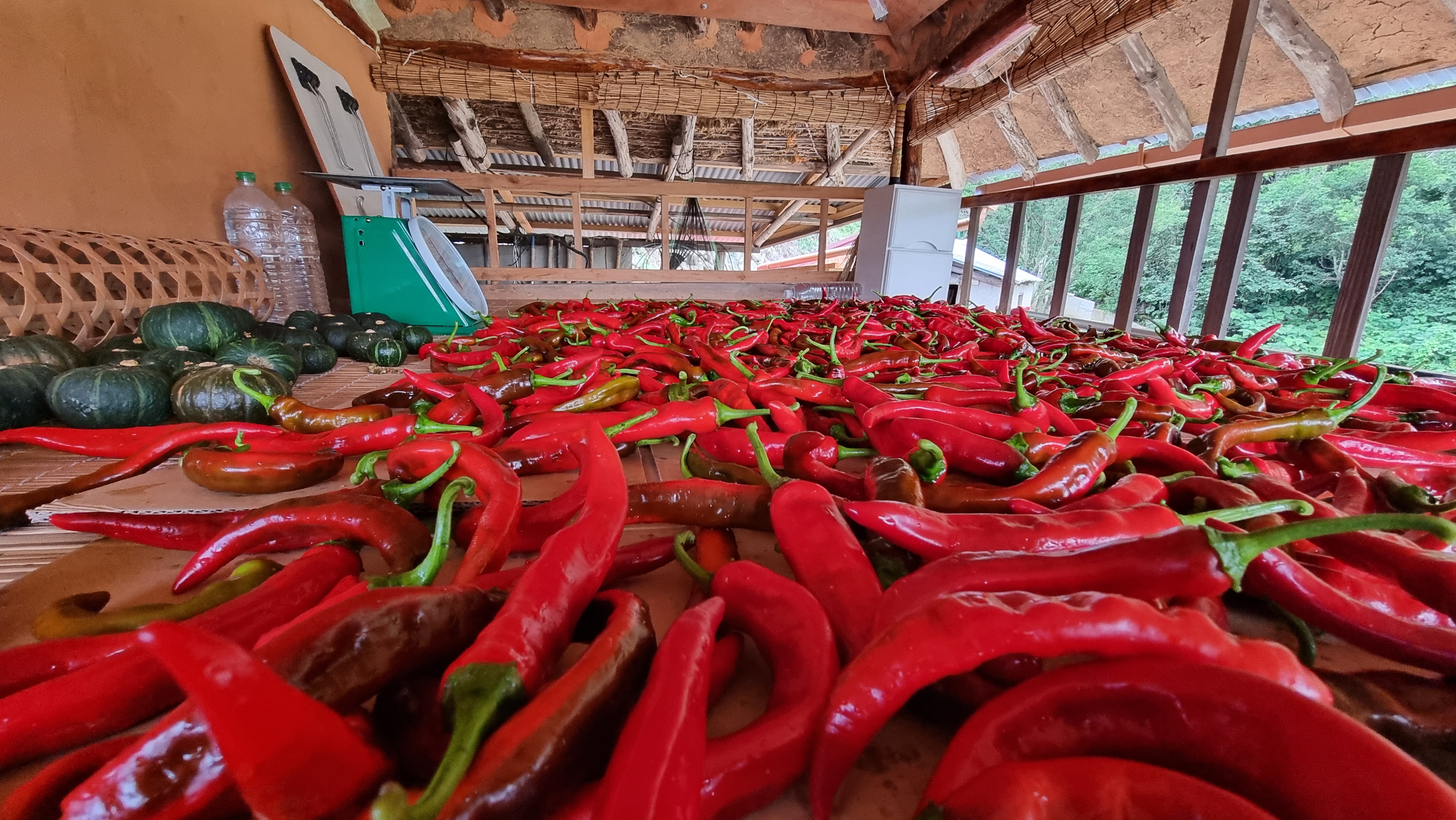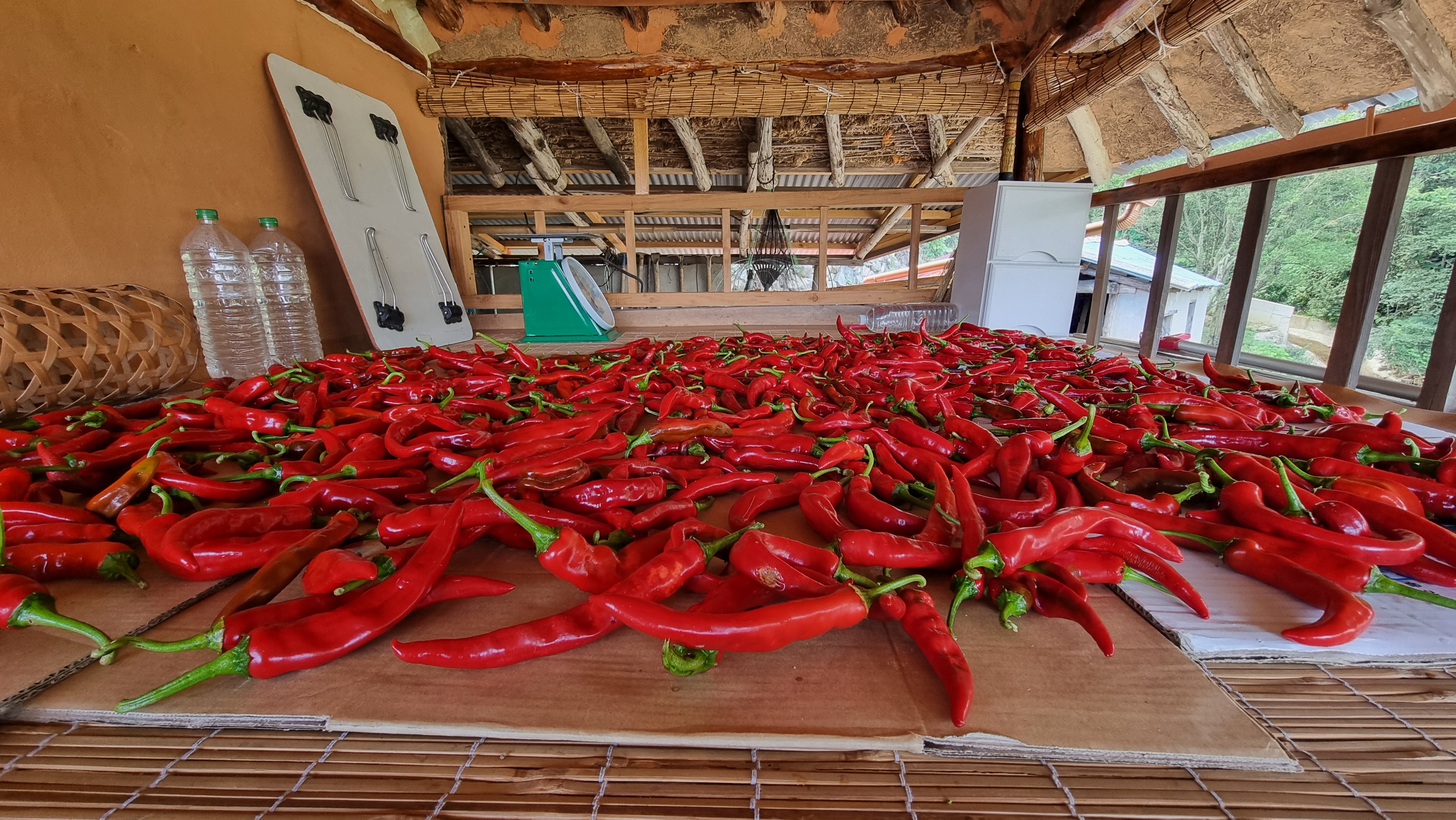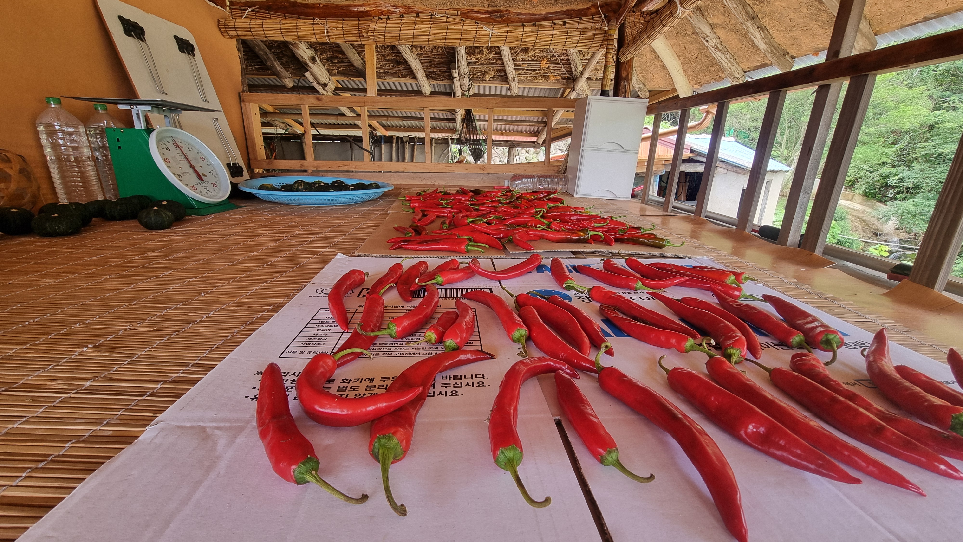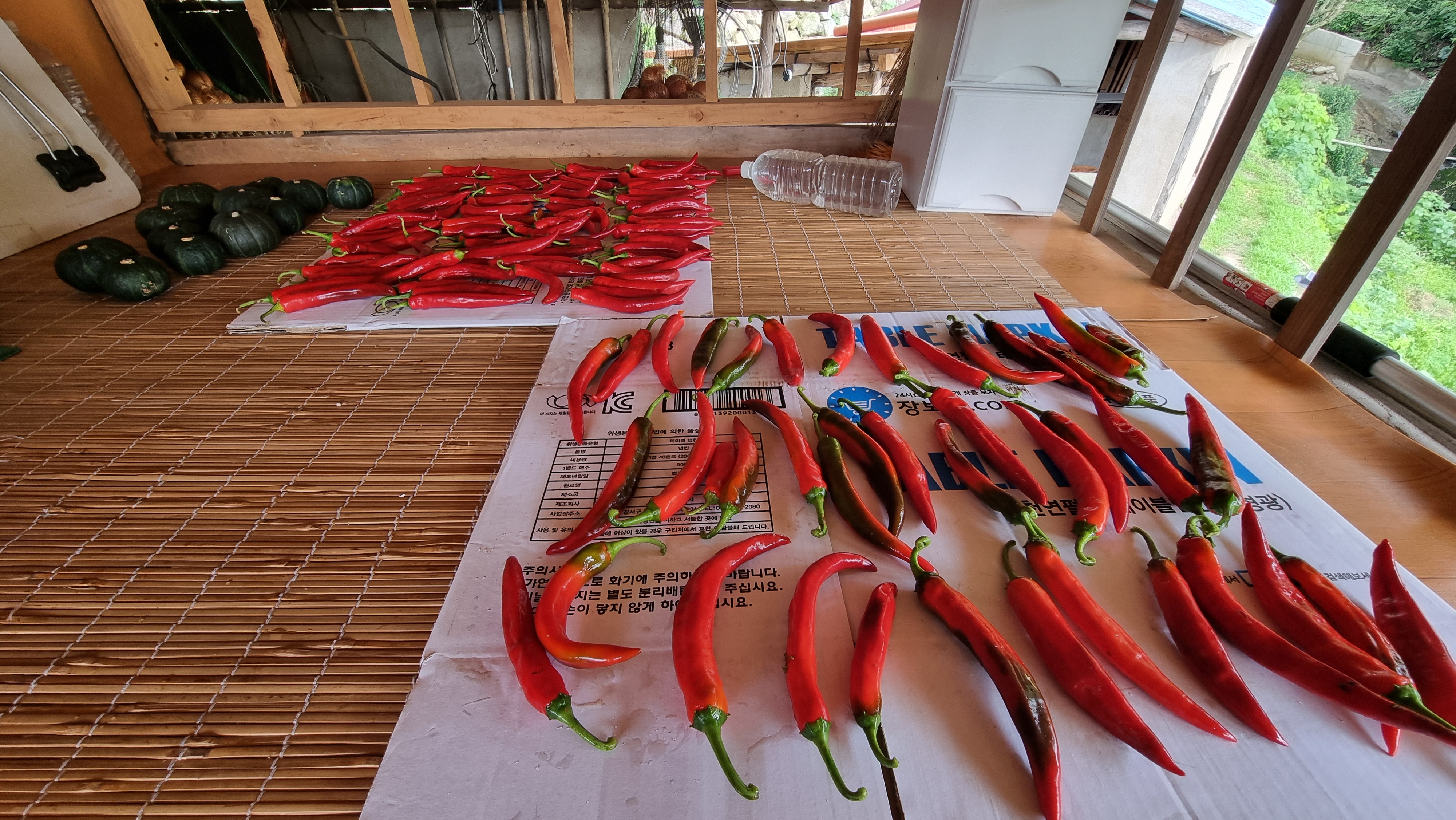 - 아침을 먹고는 느즈막이 읍내에 볼일이 있어 나가다. 간 김에 점심도 먹고 들어왔다. 오후에는 붉은 고추를 좀 땄는데, 얼마 전에 이어 두 번째다. 딴 고추는 씻어서 다락 쉼터에 얼마 전에 딴 고추와 구분해서 늘어 놓았다. 그기에 가끔 먹으려고 남겨 놓은 단호박도 조금 있다.