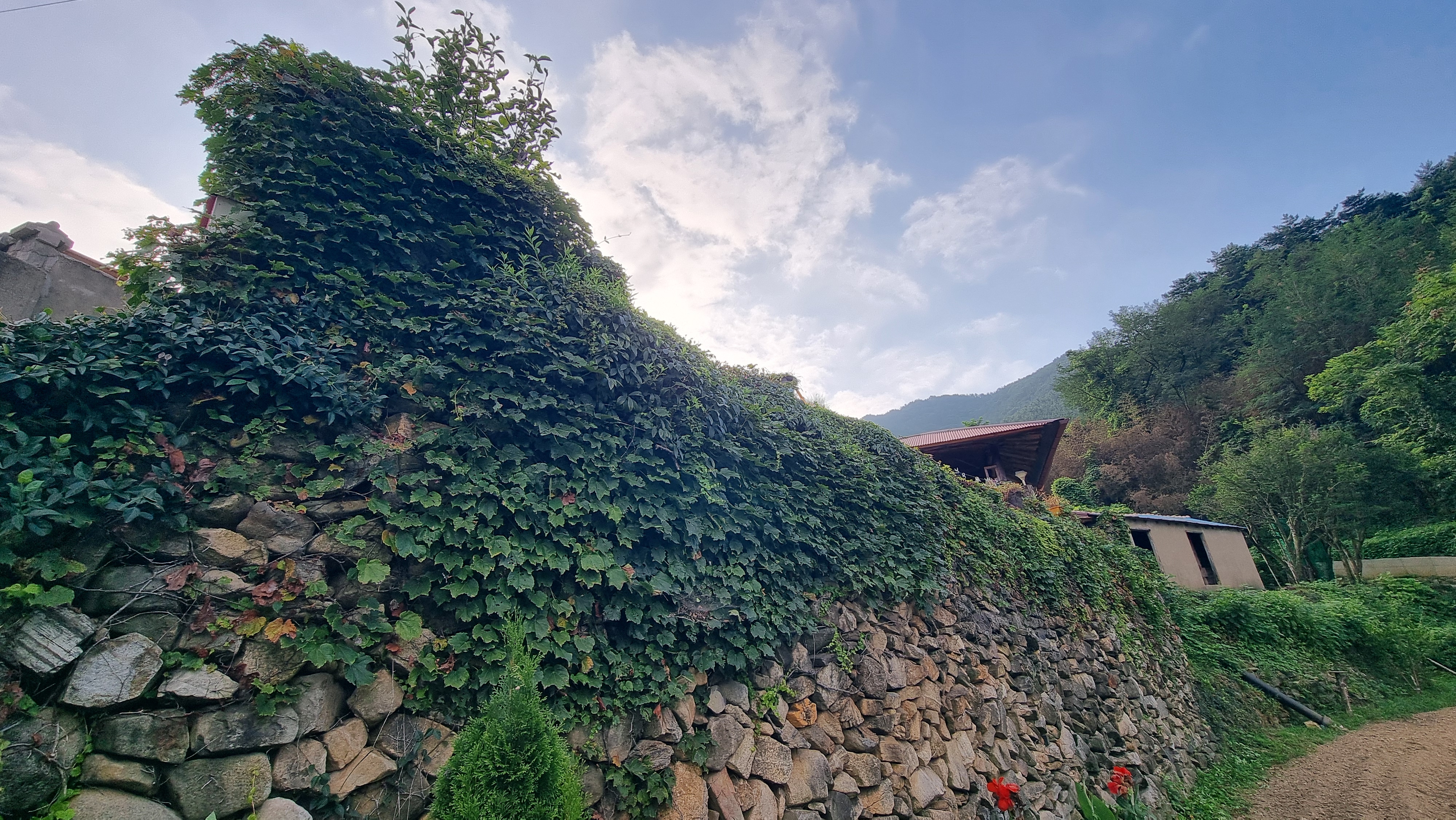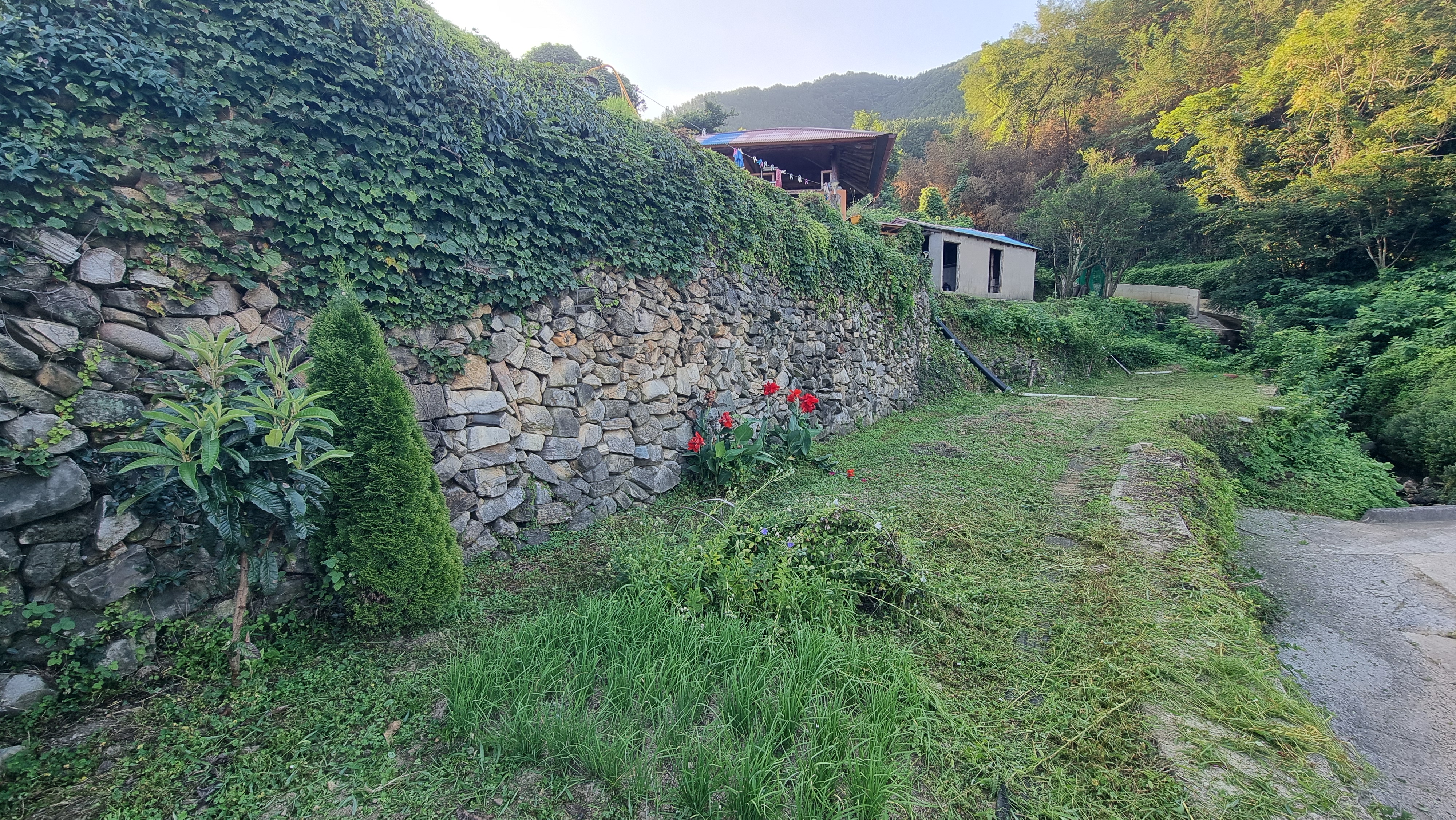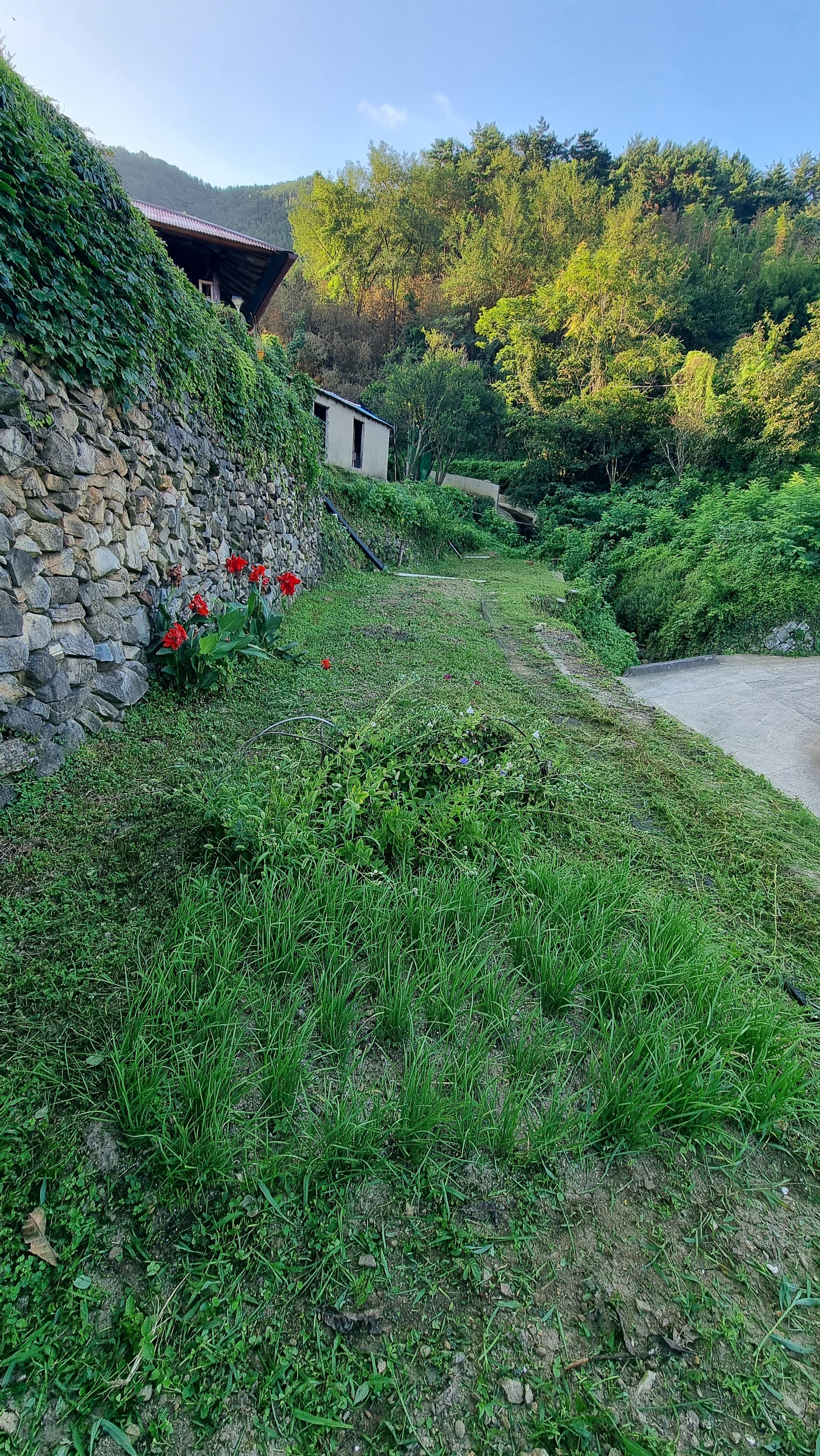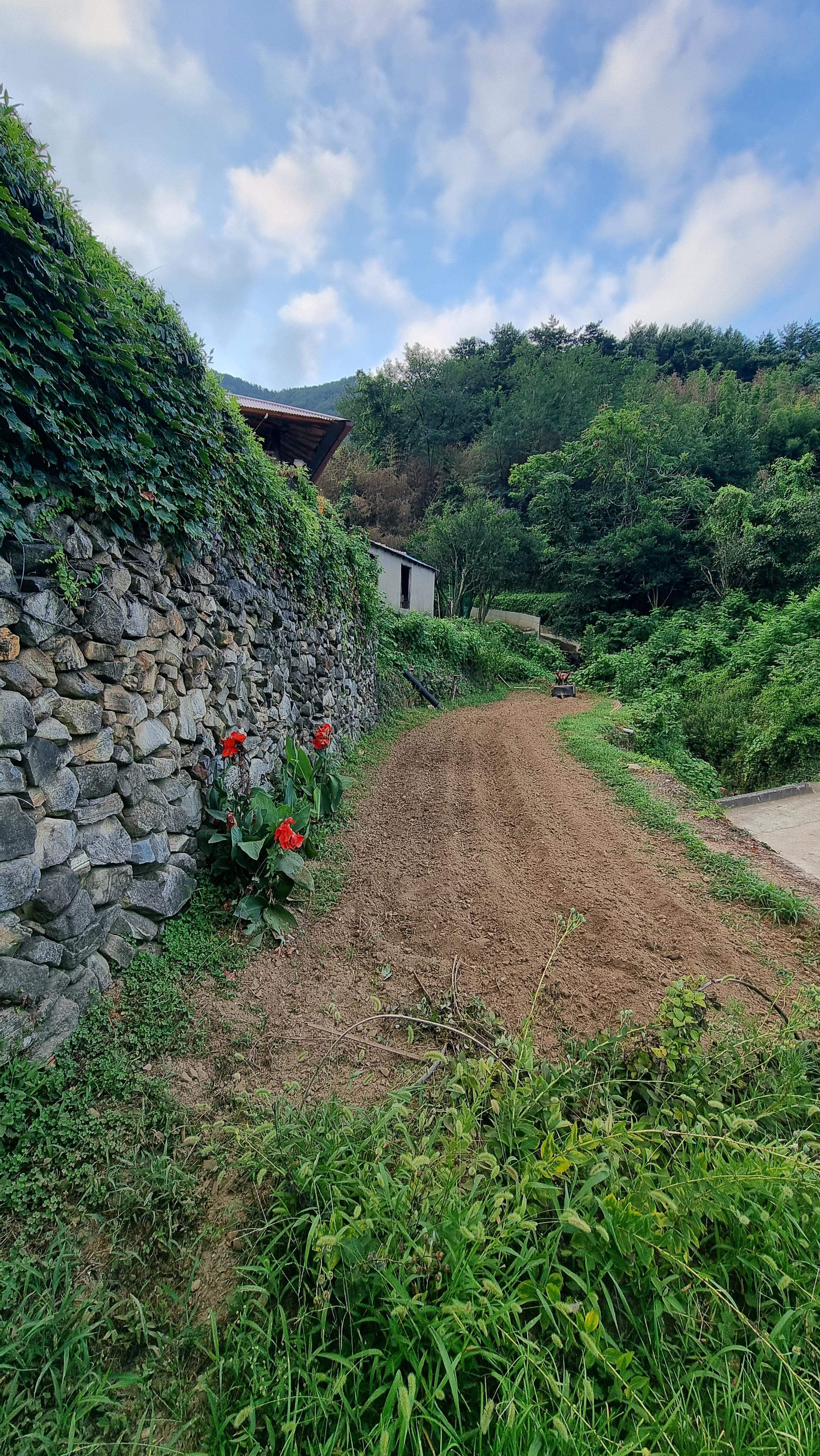 - 예초기를 메고 집 뒤쪽 언덕과 집과 돌담 사이에 작업을 했는데, 뒤쪽 언덕은 풀이 우거져 있어 예초기로도 겨우 사람이 다닐 수 있을 정도로만 작업을 했고, 또 집과 돌담 사이의 작업은 그 공간이 너무 좁아 예초기를 메고 다니는 것 조차 힘들다. 아무튼 땀을 뻘뻘 흘리면서 한 시간 남짓 작업을 했지만 다 하지 못했다. 내일도 그 쪽으로 이어서 해야 할 듯하다. 작업하는 자체가 어려운 곳이다.