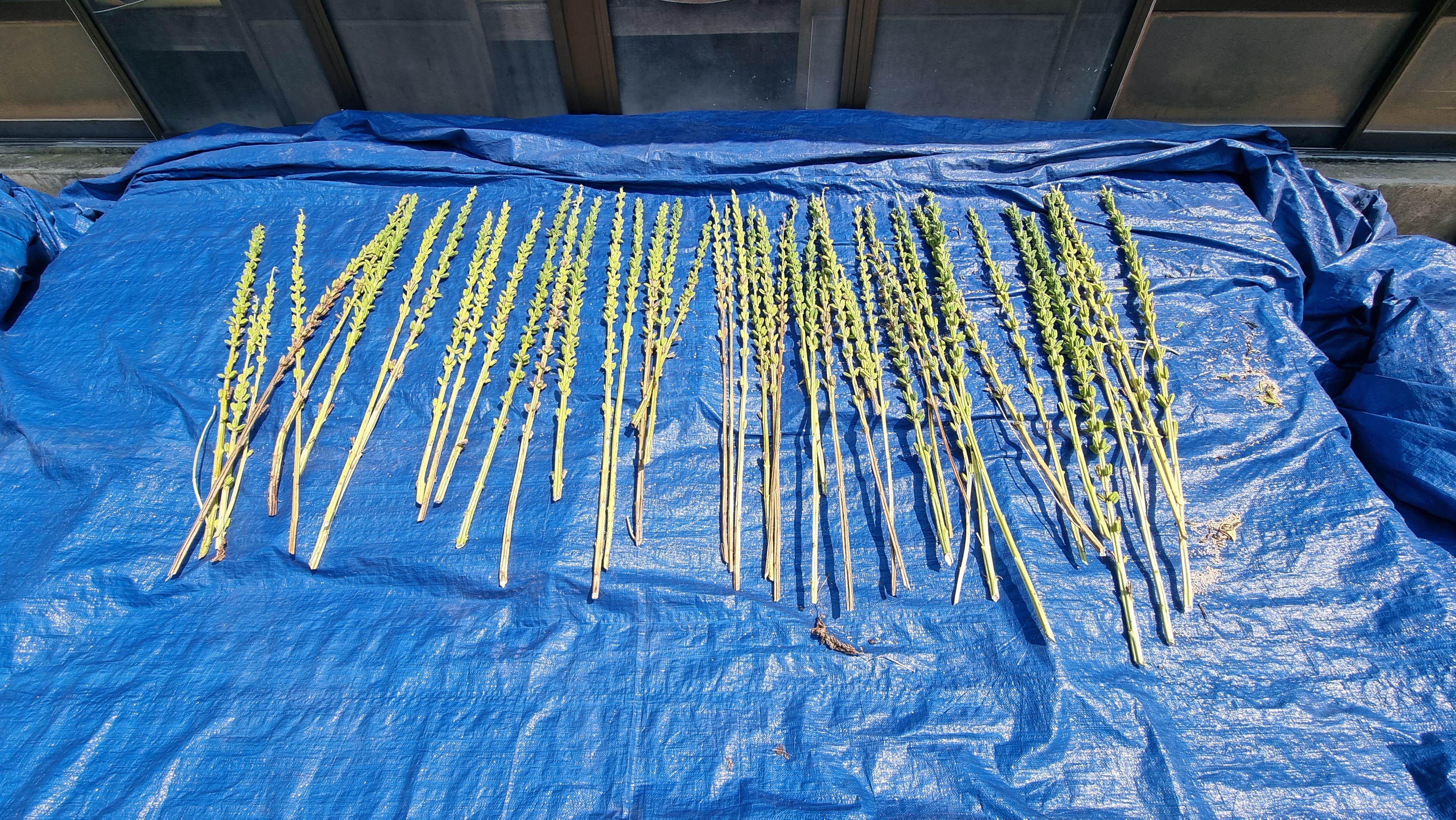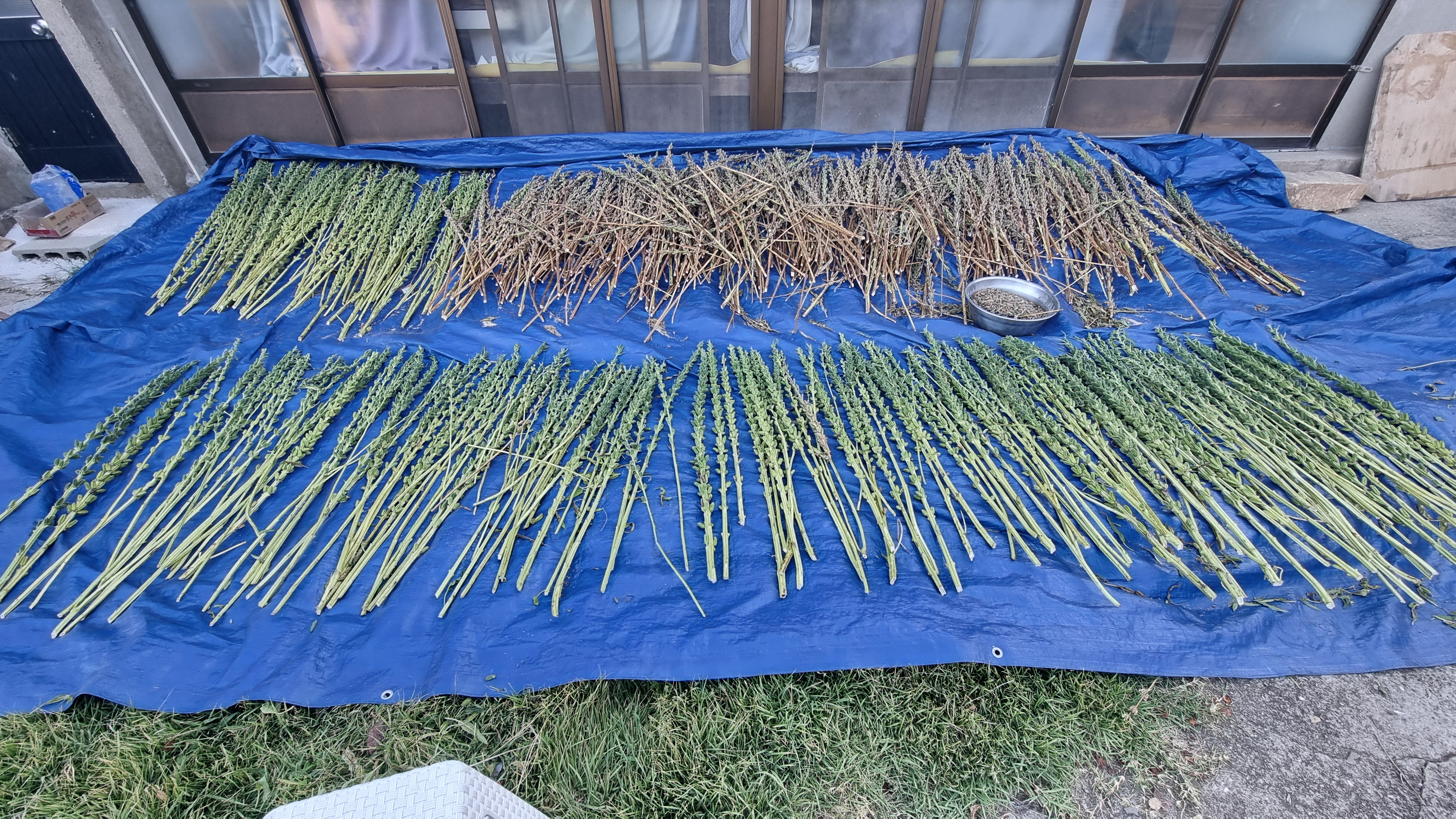 - 애매한 참깨 수확. 오늘 이웃 할아버지가 우리 집을 지나가실 때 물었더니 여러가지 얘기를 해 주시는데 이 또한 다른 분들과의 차이도 있었다. 각자 본인의 경험에서 오는 말씀들일테지. 오늘 할아버지께서 중요한 말씀을 해 주셨는데, 마당에 널어 놓은 참깨대를 보시더니 지팡이로 이런 것들 몇 개를 별도로 말려 씨를 받아 내년에 심으라고 말씀을 해 주셨다. 내용인 즉, 참깨 씨 주머니가 많이 달린 것을 말하는 것이다. 내가 봐도 똑같이 심었는데, 확연한 차이가 있었다. 그래야겠다.