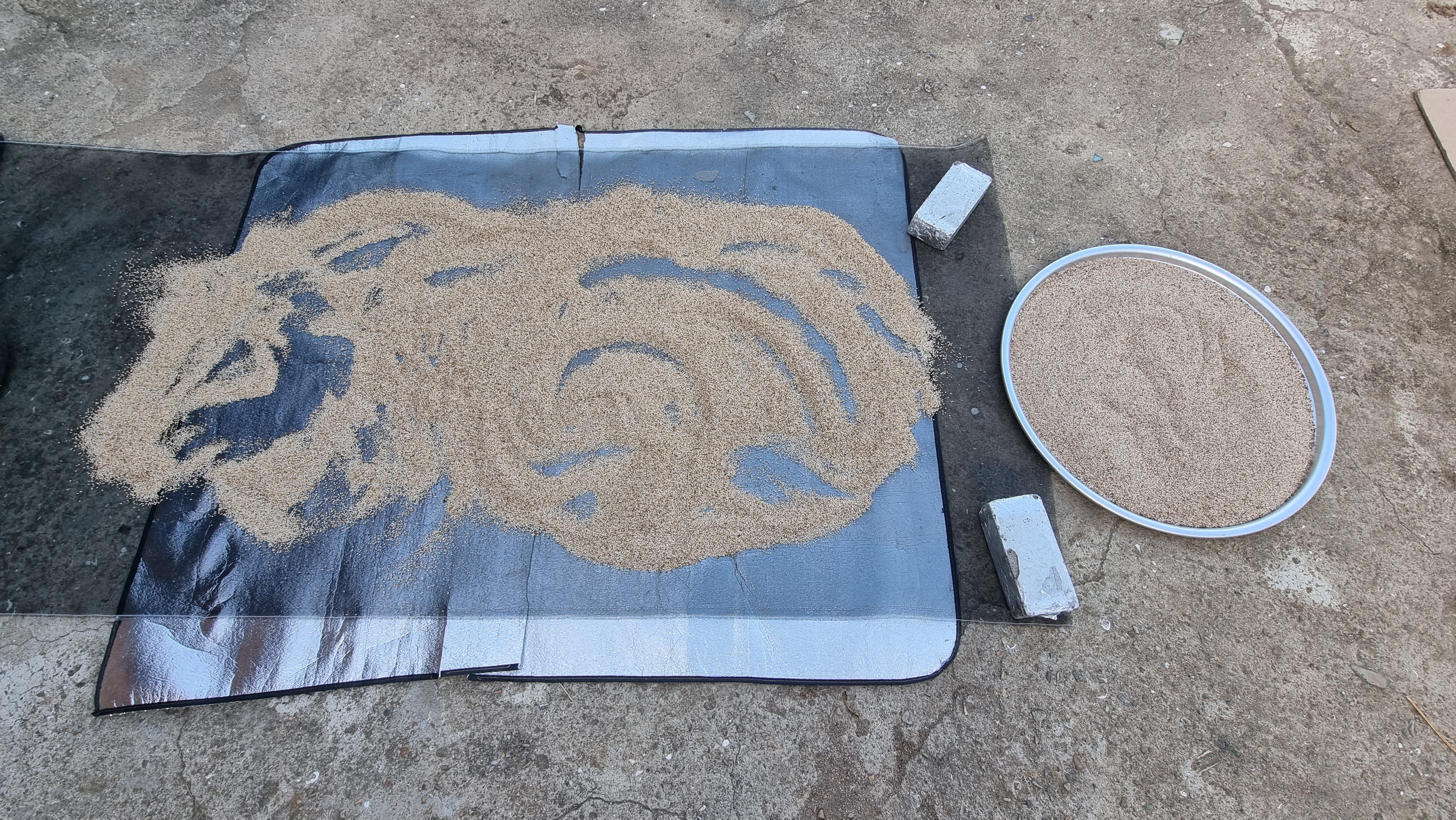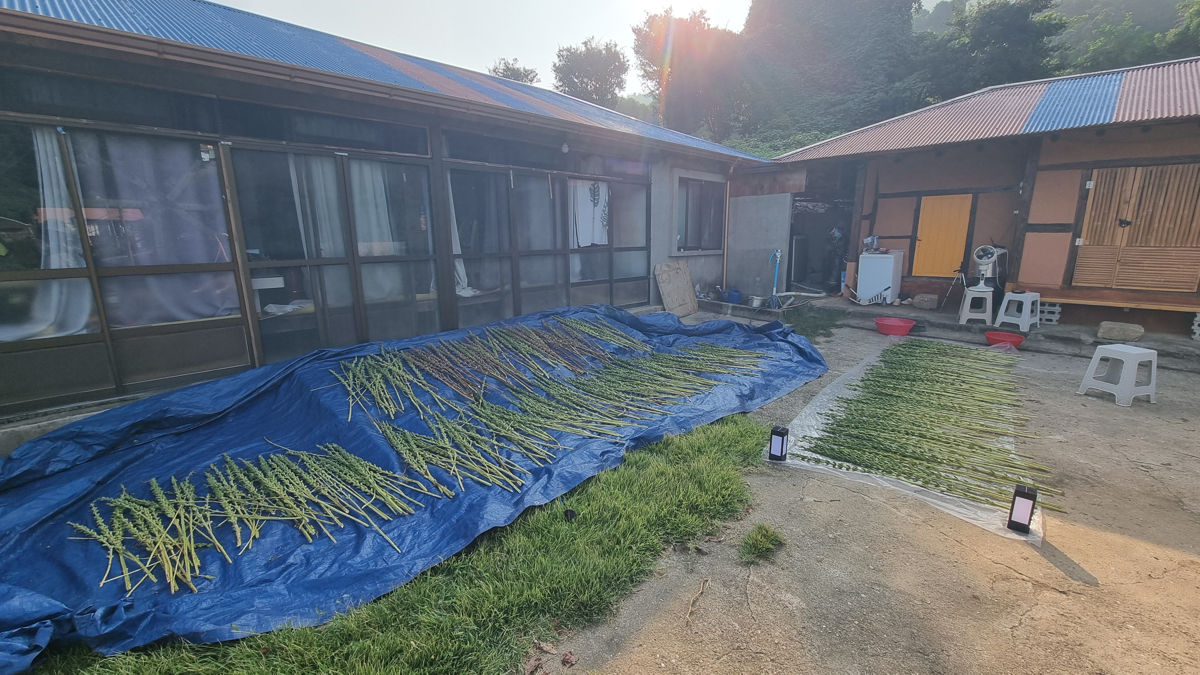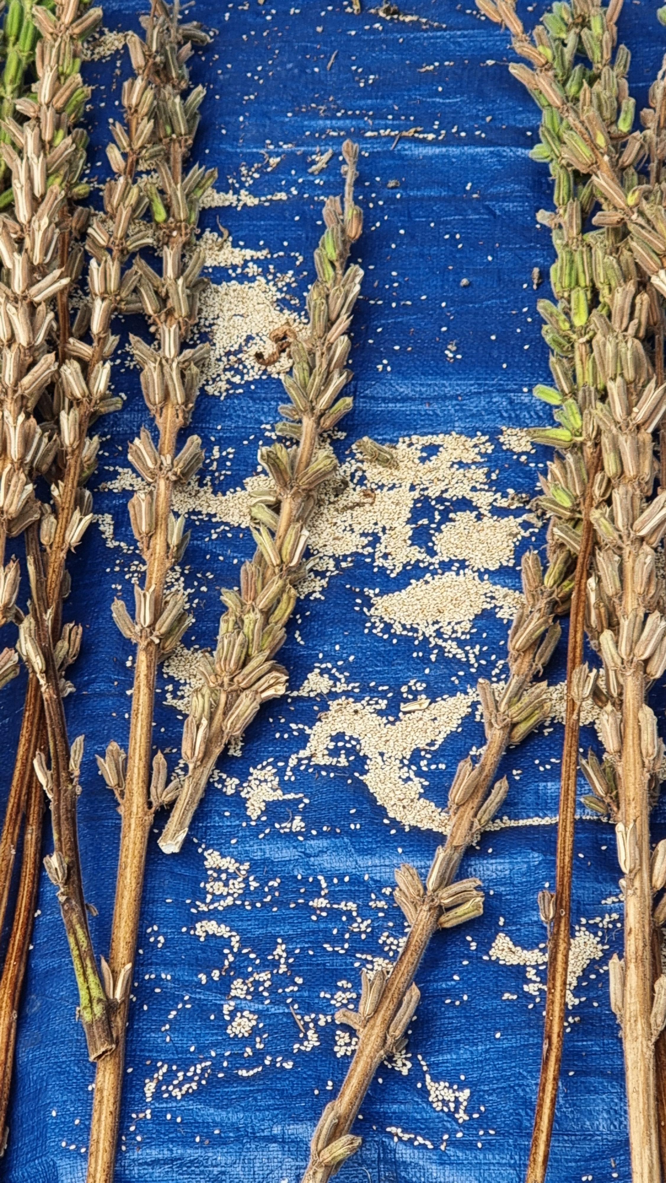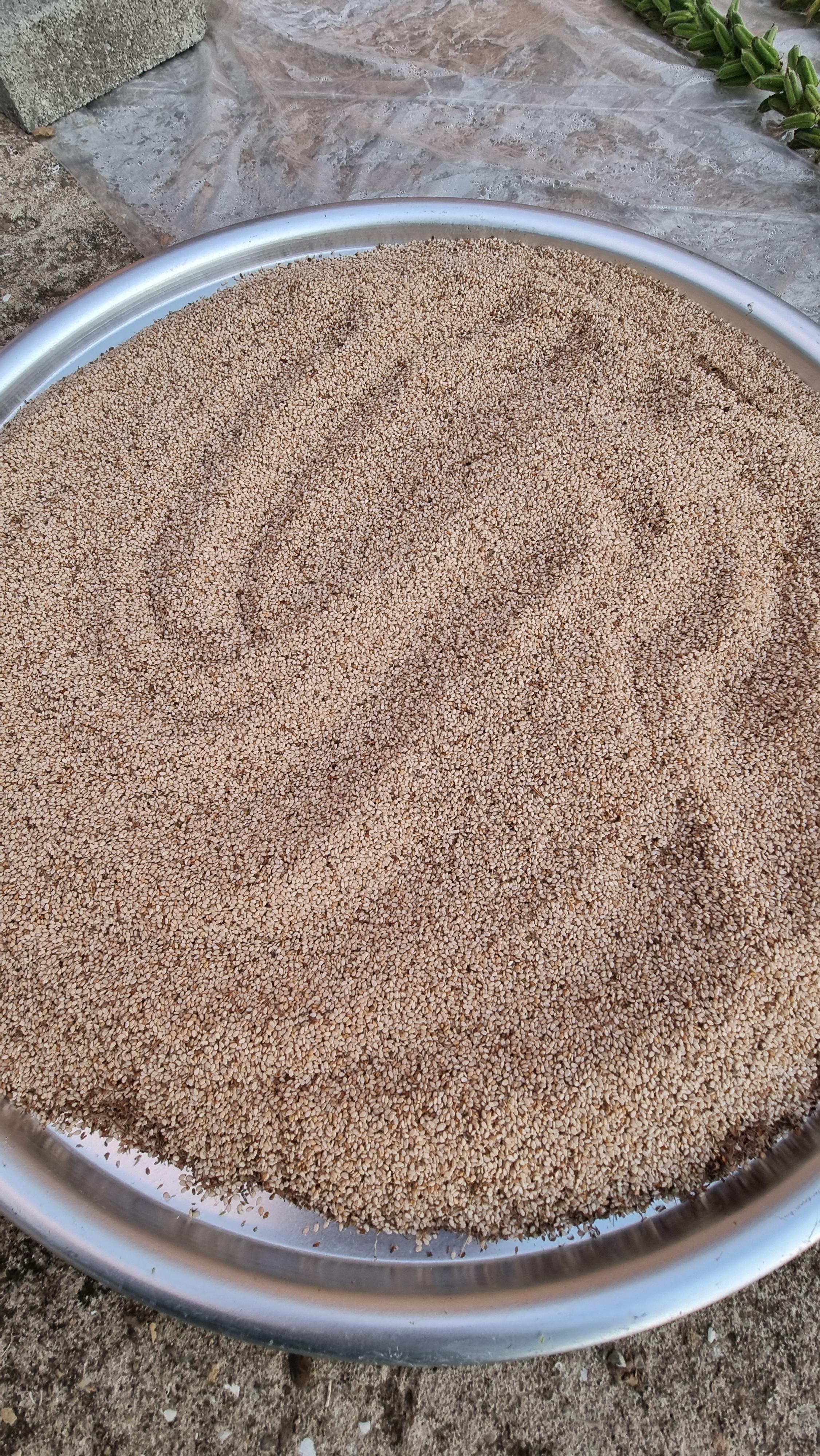 - 수확한 참깨는 미리 밭에서 잎파리를 거의 제거한 상태지만 나머지 잎들을 깨끗이 제거하고는 넓은 천막에 널어 놓았다. 저녁마다 또는 소나기 등 비가 올 때마다 실내로 거둬 들일 수가 없어서 비스듬하게 경사를 만들어 천막으로 덮는 방법을 선택했다. 날씨가 좋을 때는 펼쳐서 널어 놓고, 밤이나 비가 올 때는 덮는....