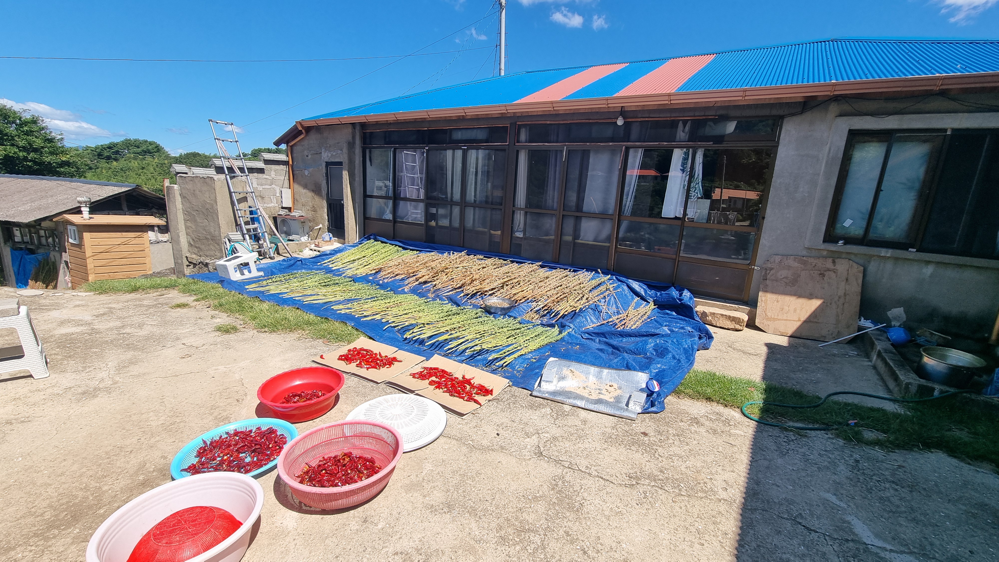 - 오늘 새벽은 가을의 한복판에 있는 듯한 느낌을 들 만큼 선선해 이불을 덮어야만 했다. 아마 바람이 조금 있어서 더 그런 것 같았다. 밖으로 나가자마자 참깨를 덮어 놓은 천막을 걷어 내고 잘 마를 수 있도록 참깨대를 고르게 펼쳐 놓았고, 고추도 창고에서 꺼내 놓았다. 그리고 아침을 먹었다.