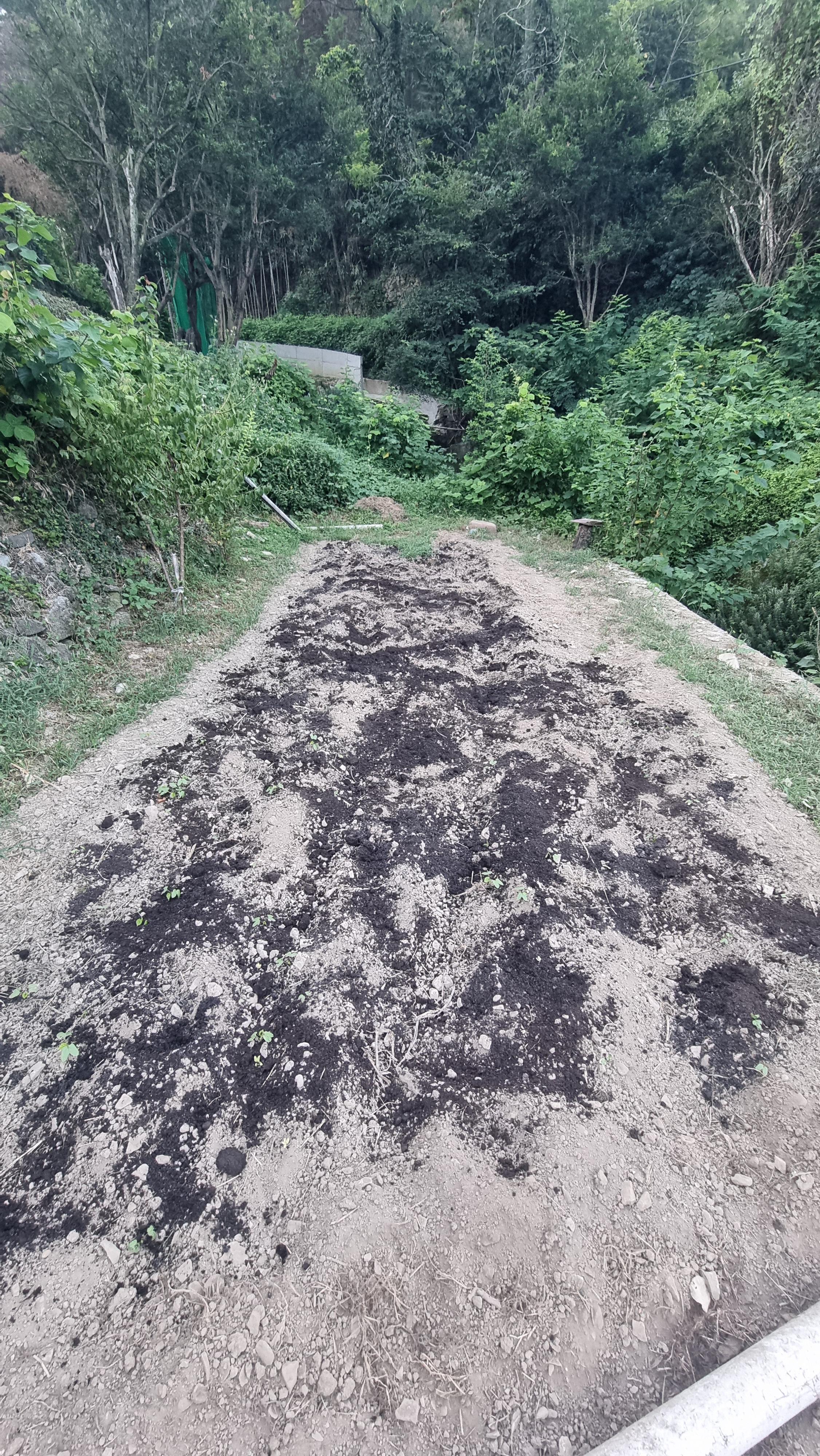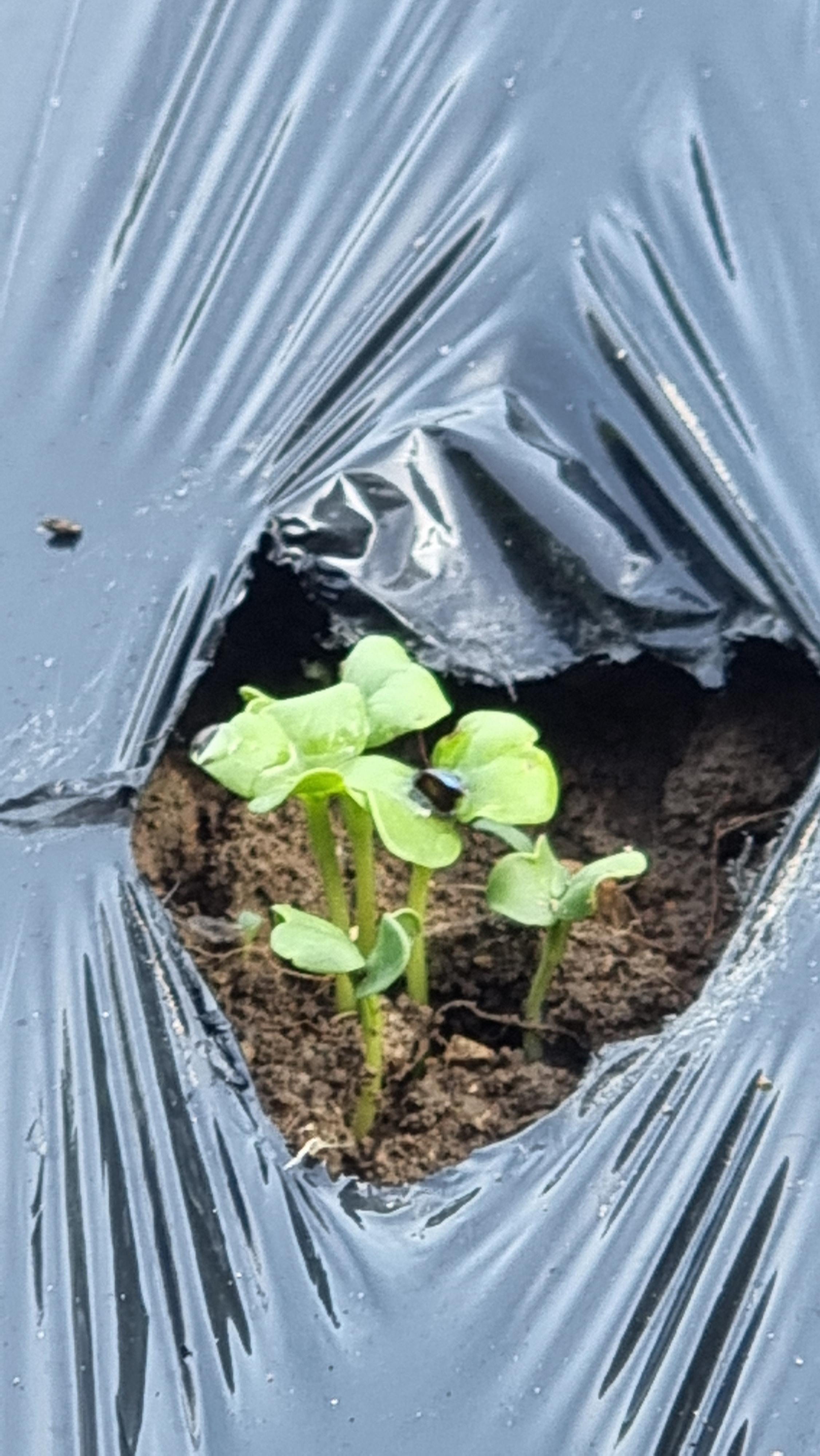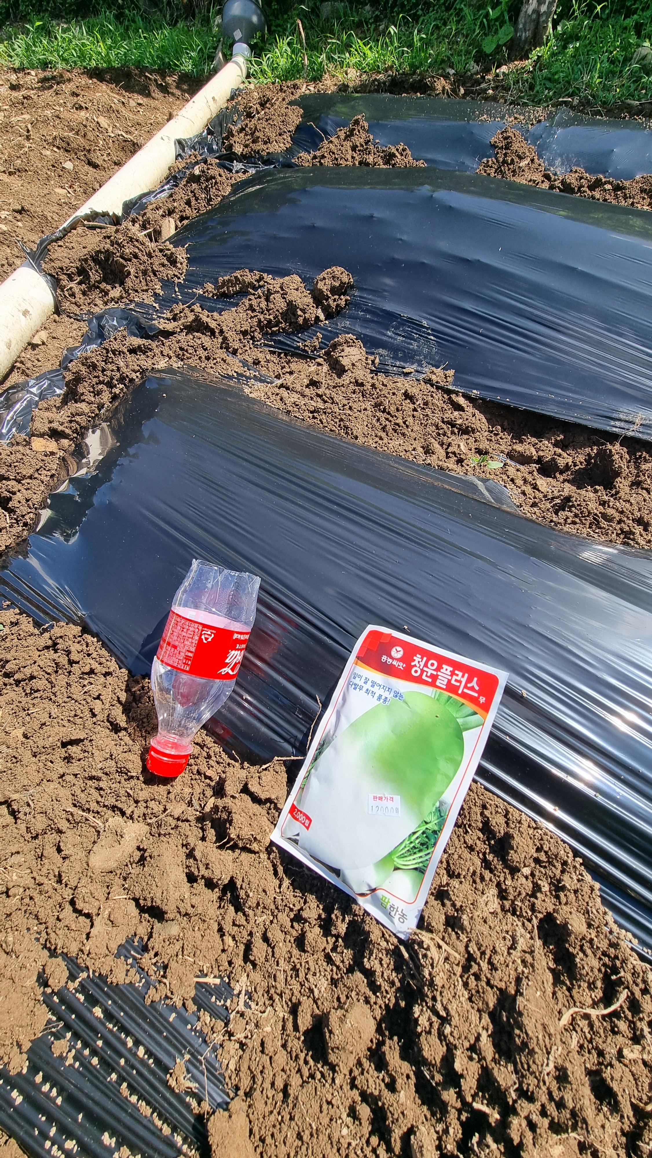 - 그리고 플라스틱 콜라병을 잘라 비닐에 4~50cm 정도의 간격으로 널직널직하게 구멍을 총 56개를 뚫었다. 그리고 그 구멍에 4~5개의 무우씨를 넣고 흙으로 살짝 덮었다. 한 개의 구멍에 4~5개의 씨앗을 넣었는데, 어떤 구멍에는 그보다 더 많이 들어간 것도 있을거다. 싹이 나오면 그 중에서 한두 개씩 부실한 것들은 솎아 내게 될 것이고, 또 어느 정도 컸을 때 나물로도 먹게 될 것인데, 최종적으로는 한 구멍에 한 개의 무우만 남게 되겠지. 잘만 자라준다면 가을 김장 무우는 50개 이상이 될 것 같다.