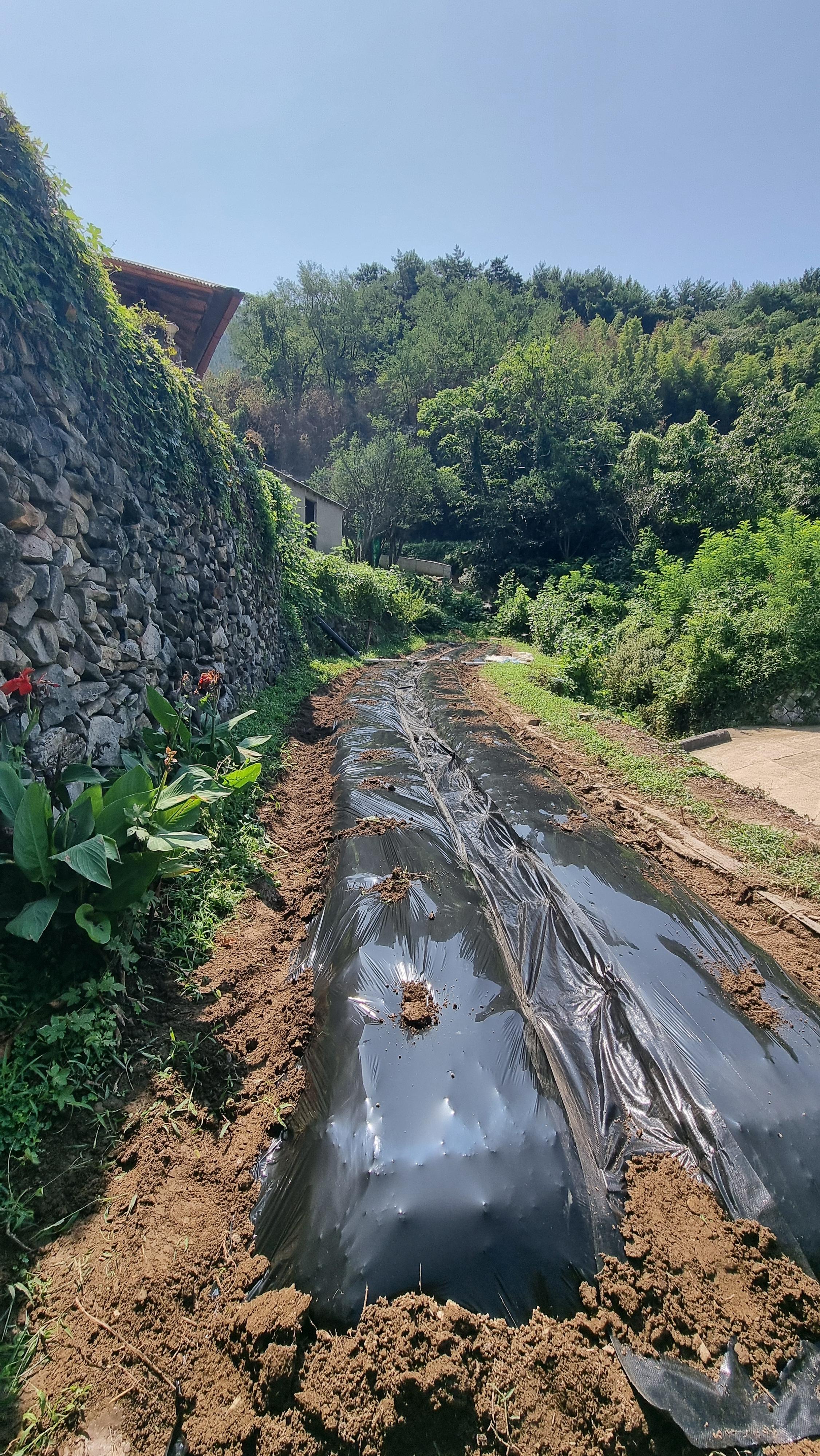 - 어제 새벽에 많은 비가 내렸다. 그래서 무우를 심으려고 만들어 놓은 두둑이 적당한 물기를 머금고 있는 상태다. 그래서 김장 무우를 심기로 했다. 농협의 영업 개시 시간에 맞춰 검은 비닐을 사왔다. 내린 비로 두둑에 드러나 있는 잔돌들을 조금 골라 내고, 검은 비닐을 씌웠다.