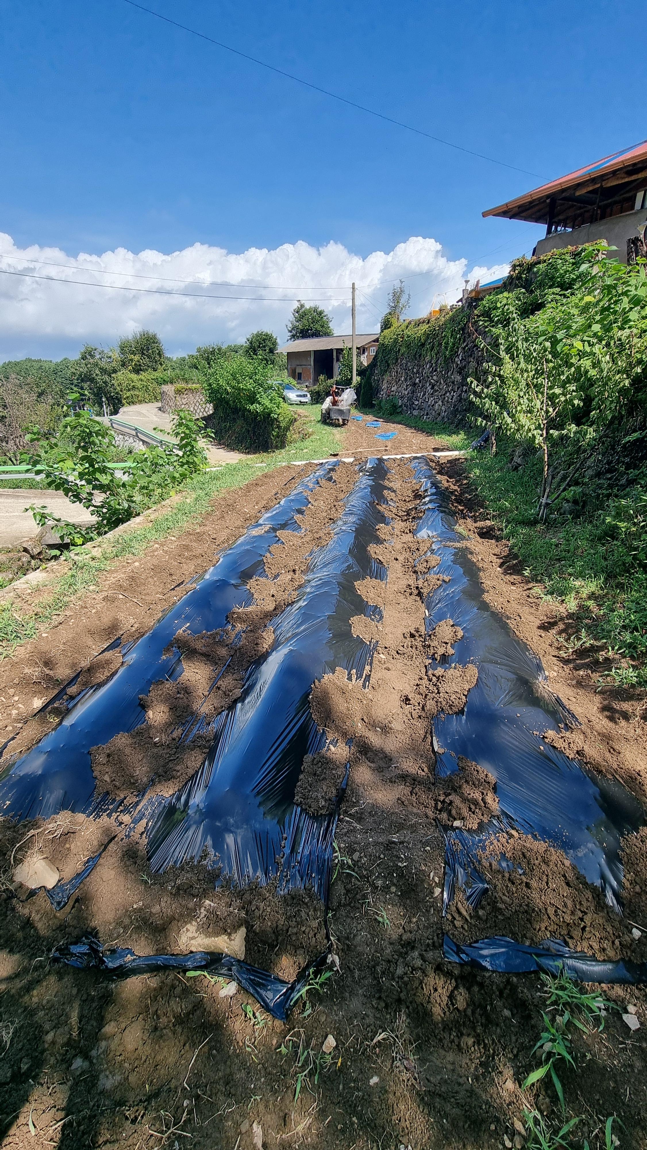 - 새벽부터 작정을 했다. 일어나자마자 어제 김장 무우를 심은 밭에 김장 배추를 심기 위한 준비 작업을 했다. 무우는 씨앗을 파좋하기 때문에 배추보다 일찍 심고, 배추는 모종으로 심기 때문에 약10~15일 정도 늦게 심는 듯 하다. 그래서 우선 밭을 만드는 작업을 했다. 어제와 마찬가지로 토양살충제와 퇴비를 뿌리고, 경운기로 로터리를 치고, 두둑을 만들고, 검은 비닐을 씌우고, 가운데 부직포를 깔고......아침 일찍부터 시작해 아침 먹는 한 시간 정도 빼고 11시까지 작업을 했다. 땀은 말할 것도 없고, 물을 얼마나 마셨는지.....