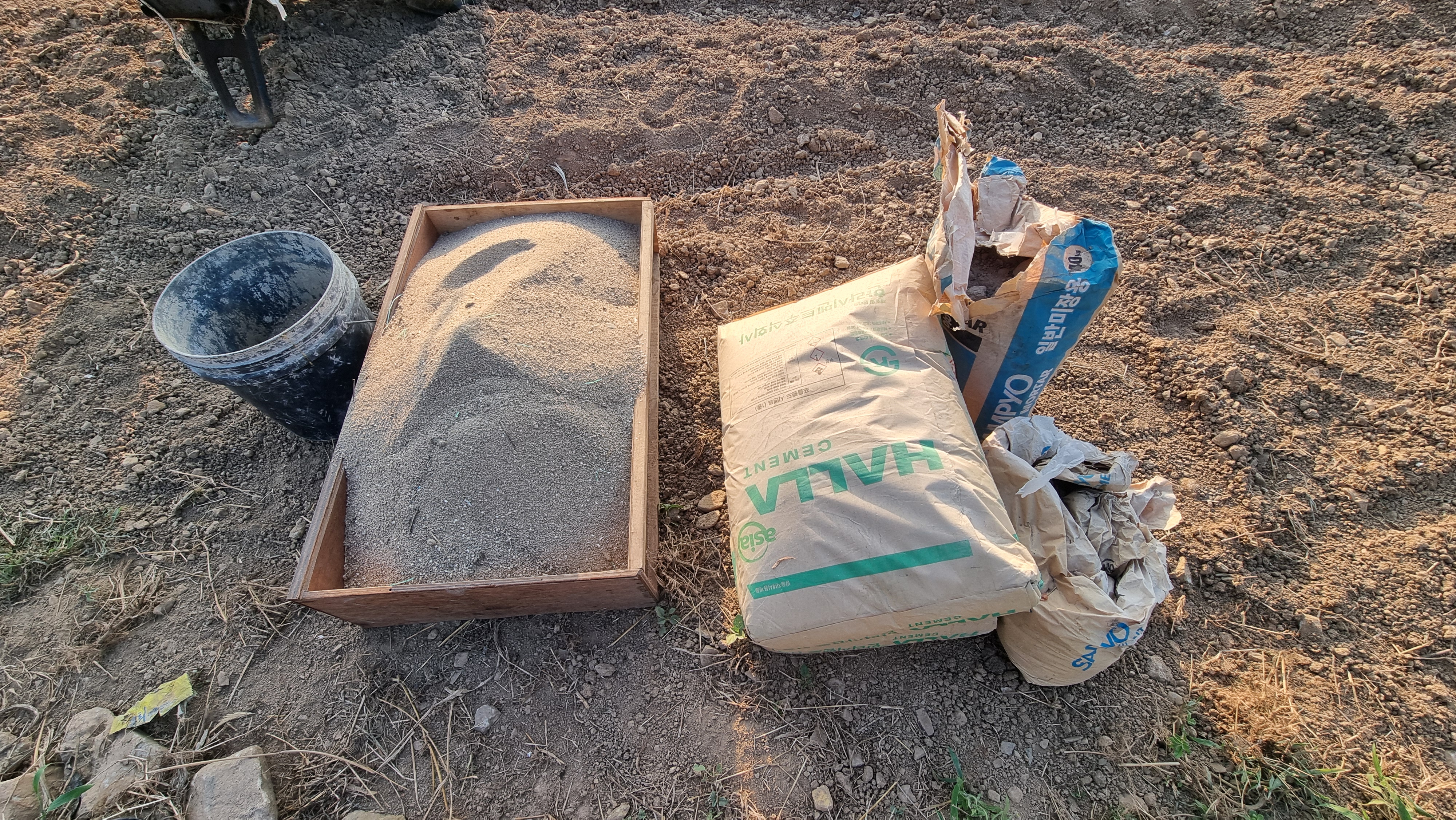 - 12시쯤 도서관으로 갔는데, 오늘은 오면서 시멘트 두 포 정도를 사가지고 와야 한다. 모래는 이전에 아랫채에 방을 만들면서 쓰고 남은 것이 좀 있기는 하지만 모자랄 듯하다. 우선 모든 작업이 준비되는 대로 해보고 모자라면 다른 방법을 찾아야겠지. 세멘트는 무거운 건축 자재다. 두 포를 지금 작업을 하는 밭에 가져다 놓았고, 집 안에 있던 모래도 바케스로 일일이 퍼다 날랐다.