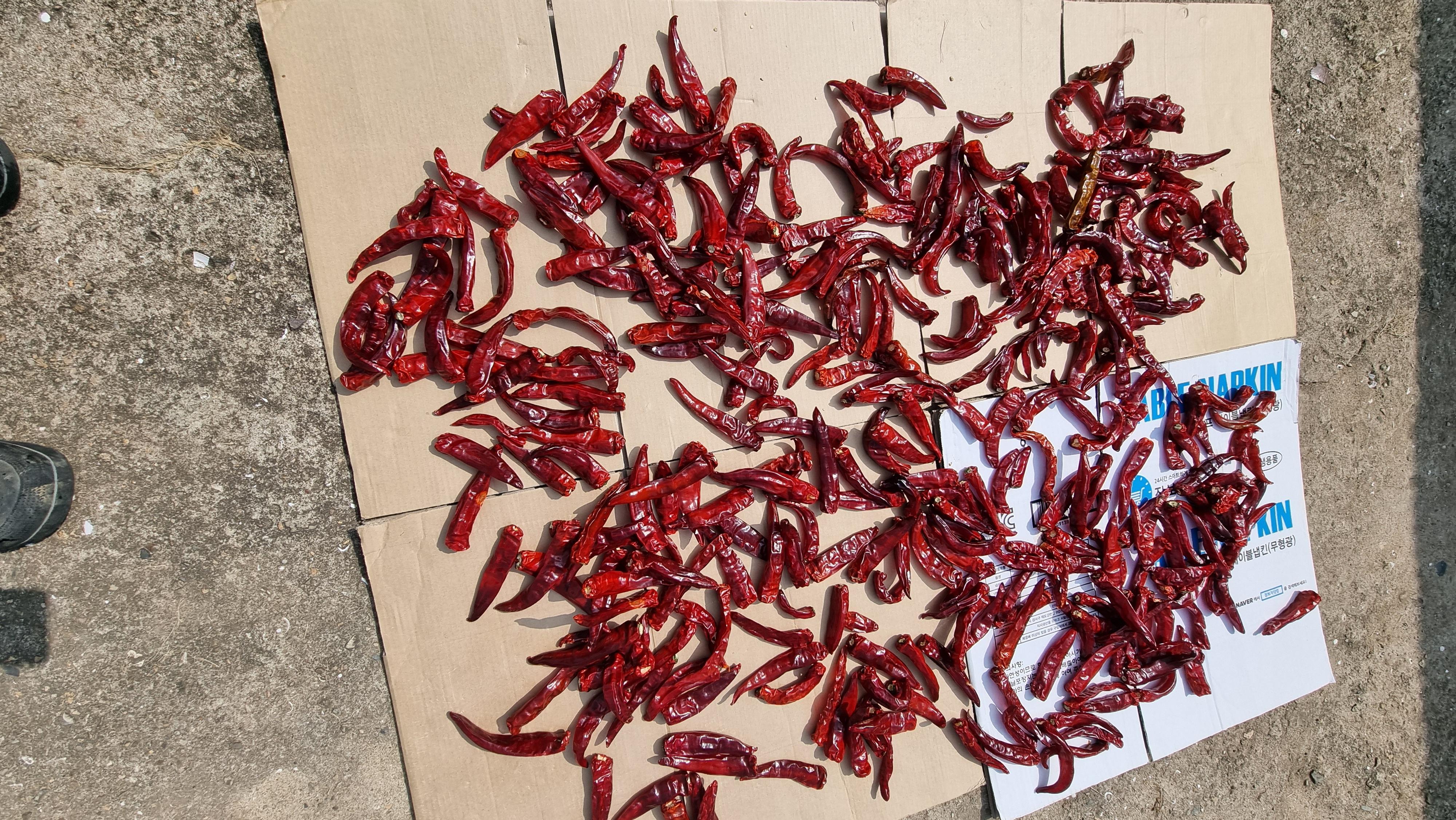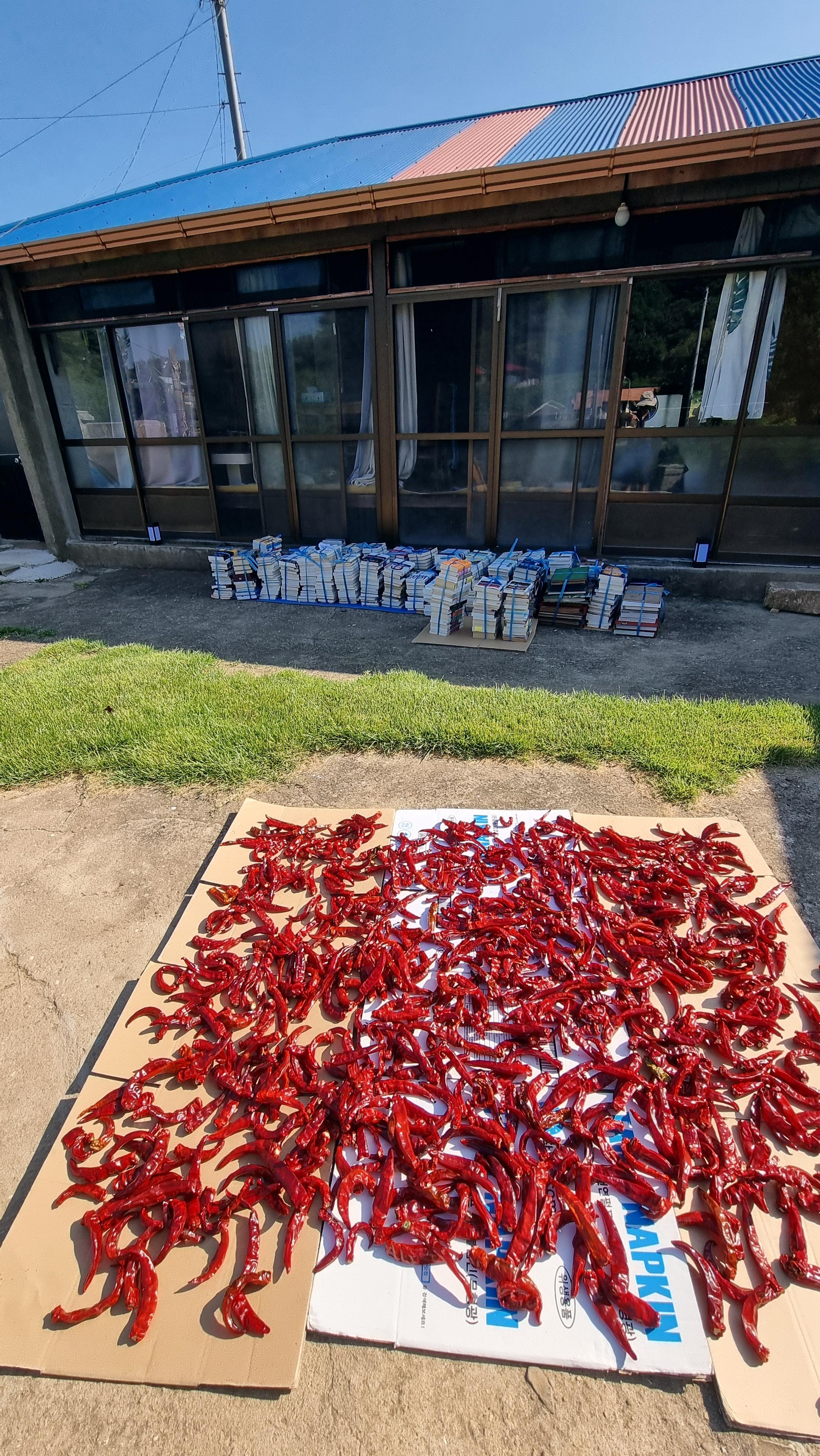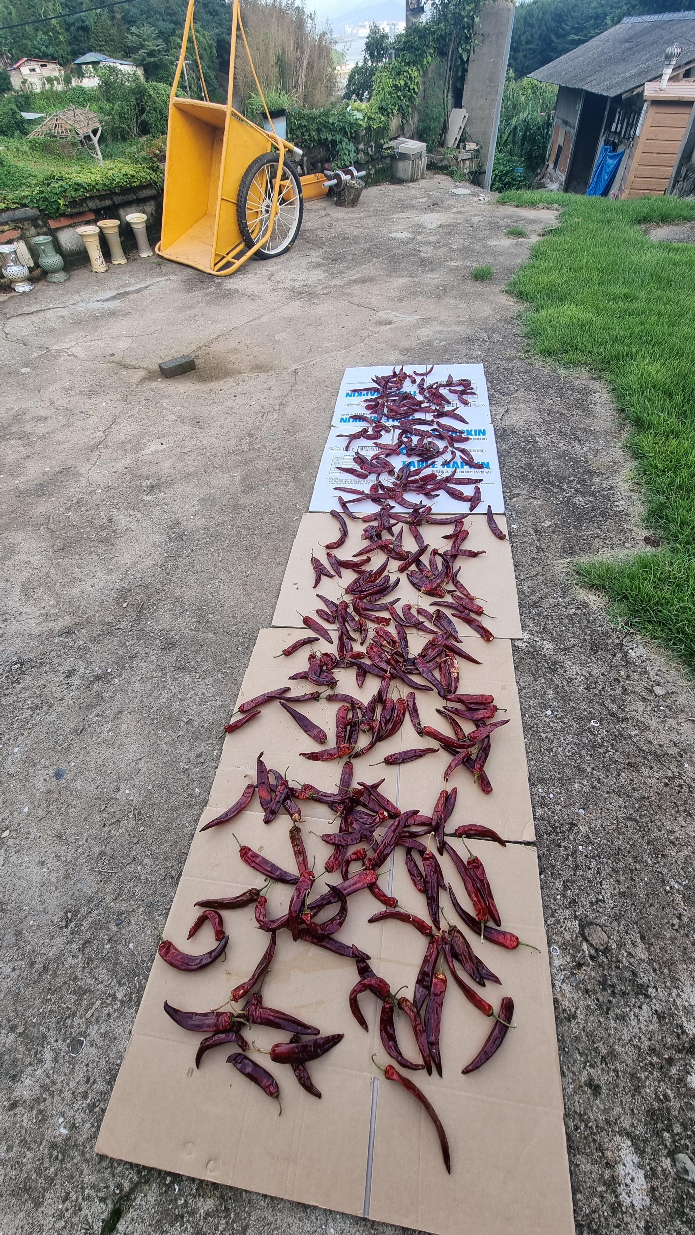 - 아침을 먹고는 익은 고추를 좀 땄다. 차례로는 세 번째 딴 것인데, 씻어서 다락 쉼터에 펼쳐 놓았다. 처음에 딴 것은 일주일 정도 그곳에서 말렸다가 마당에 펼쳐 놓았고, 오늘 딴 것과 두 번째 딴 것은 쉼터인 그늘에서 일주일 정도 말린 후, 태양 초로 말린다. 저녁 늦게 걷기 운동도 좀 했다. 폭염이 기승을 부리는 요즘이고, 폭염에 대한 경고 문자도 자주 접한다. 건강에 조심하자.