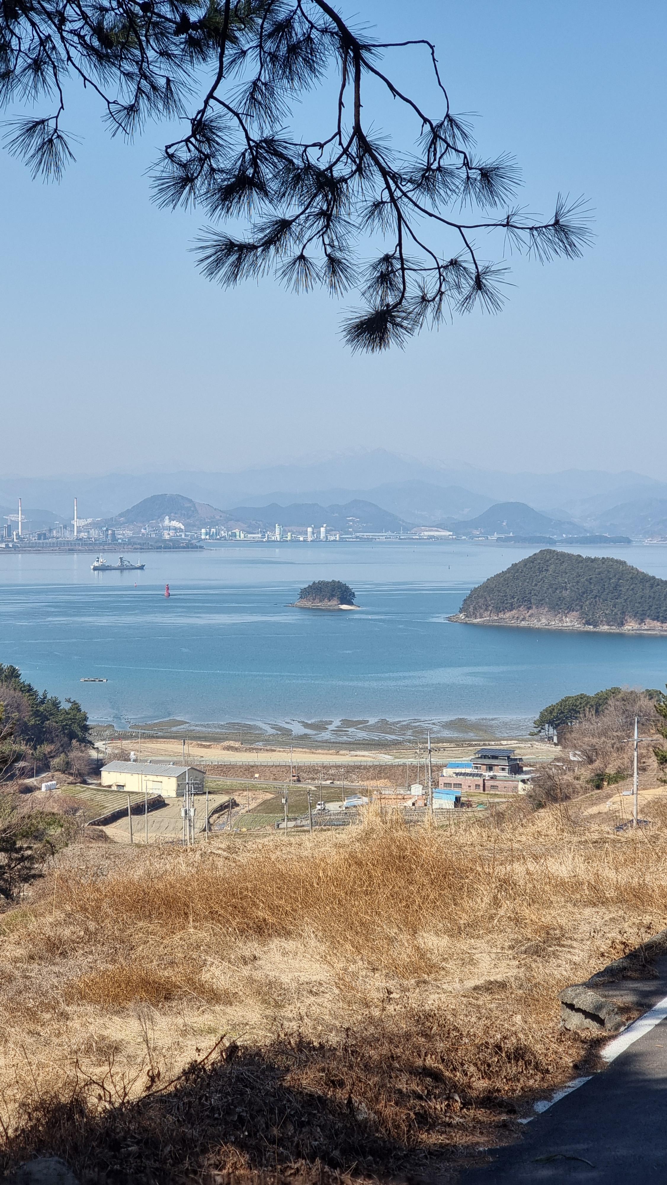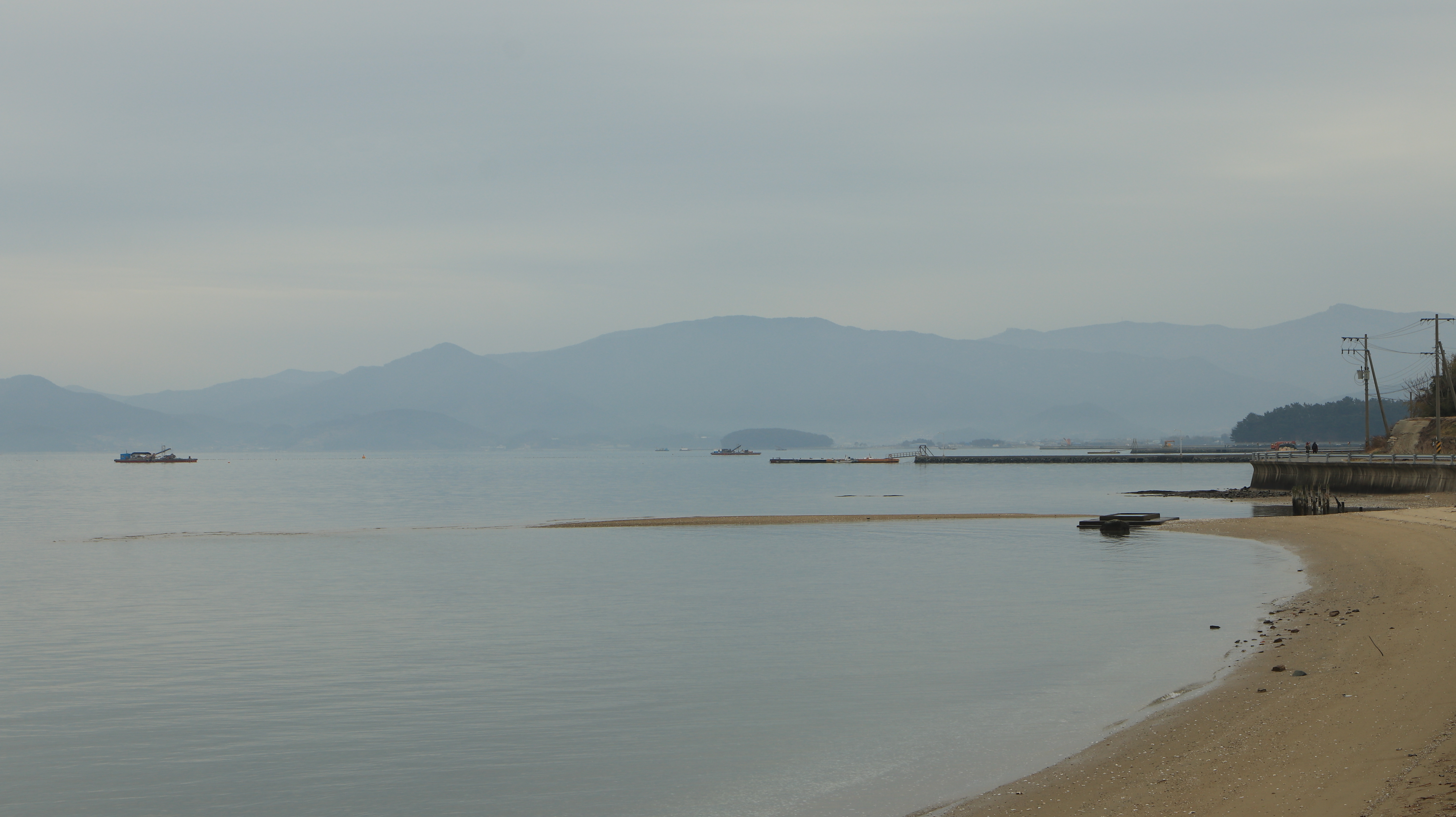 - 점심을 먹고 나서는 각자 자유롭게 하산을 했다. 12시 정도 정상에서 하산을 시작했다. 임도를 따라 약 40분 정도 내려왔을 때 해안선에 닿았다. 그곳에서부터는 아침 집결지였던 '남해문화원' 주차장까지 해안선을 따라 걸었다. 바다 건너 보이는 망운산, 호구산, 금산 등....크고 작은 산들이 흐린 날씨로 몽한적인, 수채화 같은 분위기를 자아냈는데, 멋졌다.