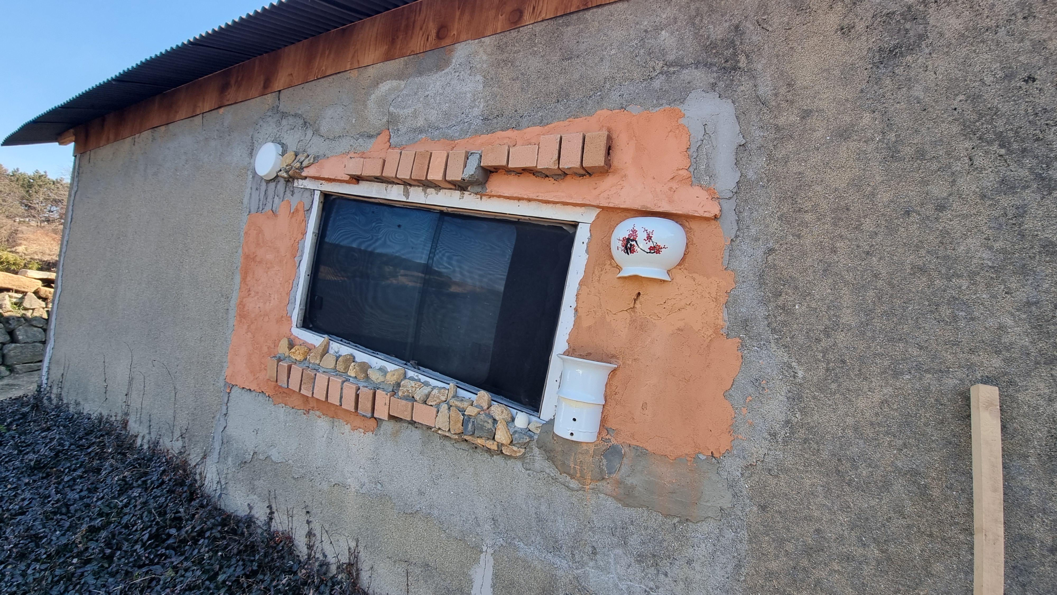 - 장작을 풀어 놓고, 온돌 부엌 외벽 단장을 시작했다. 단장이라 해서 특별한 것은 아니고, 고운 황토가루를 물에 풀어 외벽에 바르는 것이다. 이 외벽은 처음 왔을 때 창문이 아닌 양철로 막아 놓았고, 막아 놓은 것도 문틀이 다 썩어 내려 앉은 상태라 내가 철근 등으로 양철이 떨어지지 않도록 고정시켜 놓았었다. 그러고 나서 구입 후 3개월이 지난 2022년 2월 중순에 자동차 유리문으로 창문을 만들어 붙였다. 그리고 오늘 그 창문 주변을 황토로 조금 단장을 한 것이다.
