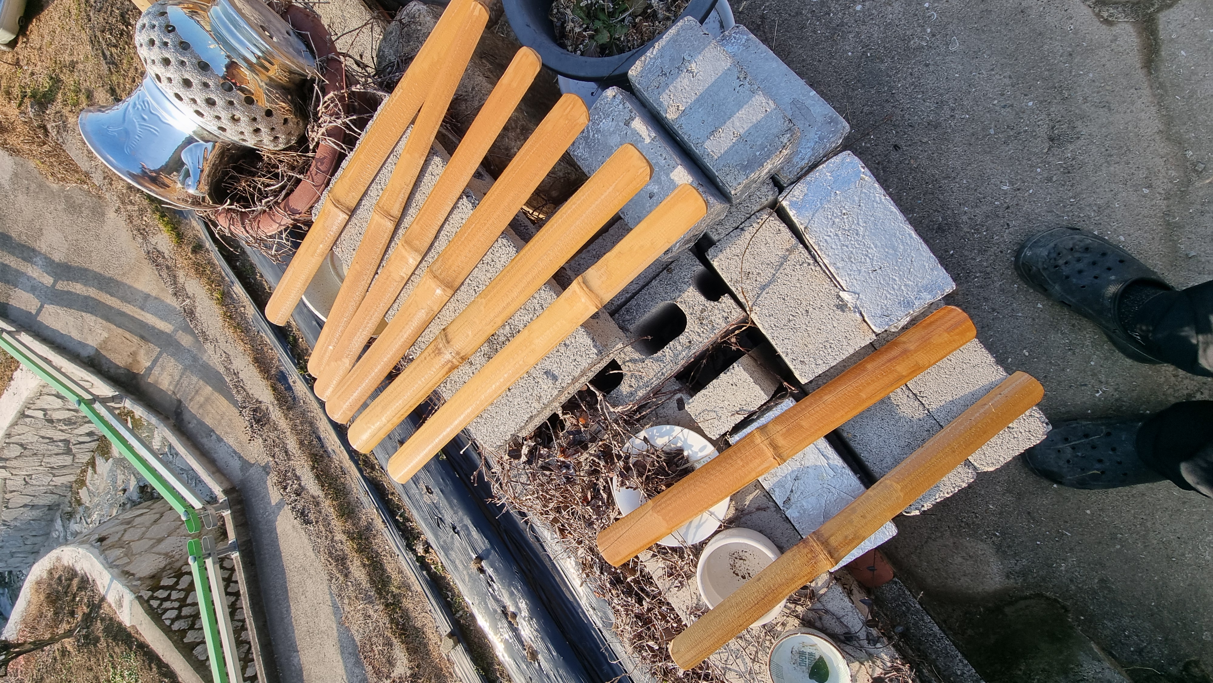 - 점심을 먹고는 우리집에 하나밖에 없는 야외 화장실에 조그만한 갤러리(또는 카우보이) 문 한짝을 달까하고 문 만드는 작업을 좀 했다. 가로 50센티미터, 세로 60센티미터 정도 작은 문이다. 우리집 화장실은 문이 없다. 그렇다고 훤히 보이는 구조는 아니다. 가장 고치고 싶은 곳 중 하나가 화장실인데, 쉬운 일은 아니다. 그래도 그런 문이라도 하나 달아 놓으면 좋지 않을까 해서다. 문살은 대나무를 갈라서 사용할 것인데, 이것도 어제처럼 그라인더로 표면을 연마한 후 니스를 칠을 하는 것이다. 이제 문살을 붙이고, 이 문에 사용할 경첩만 사서 부착하면 된다. 요즘 같이 조금 시간이 있을 때 할 수밖에.