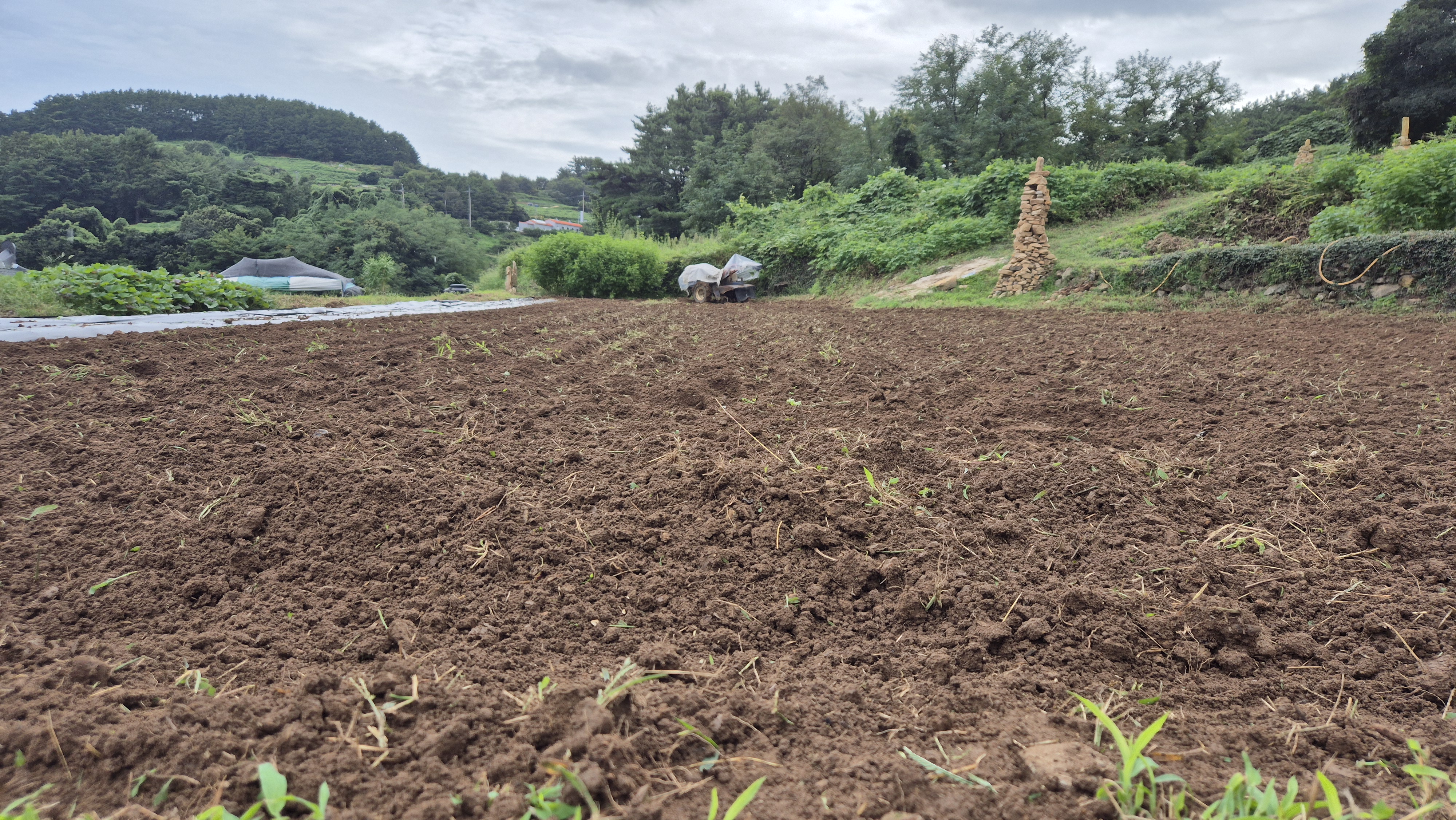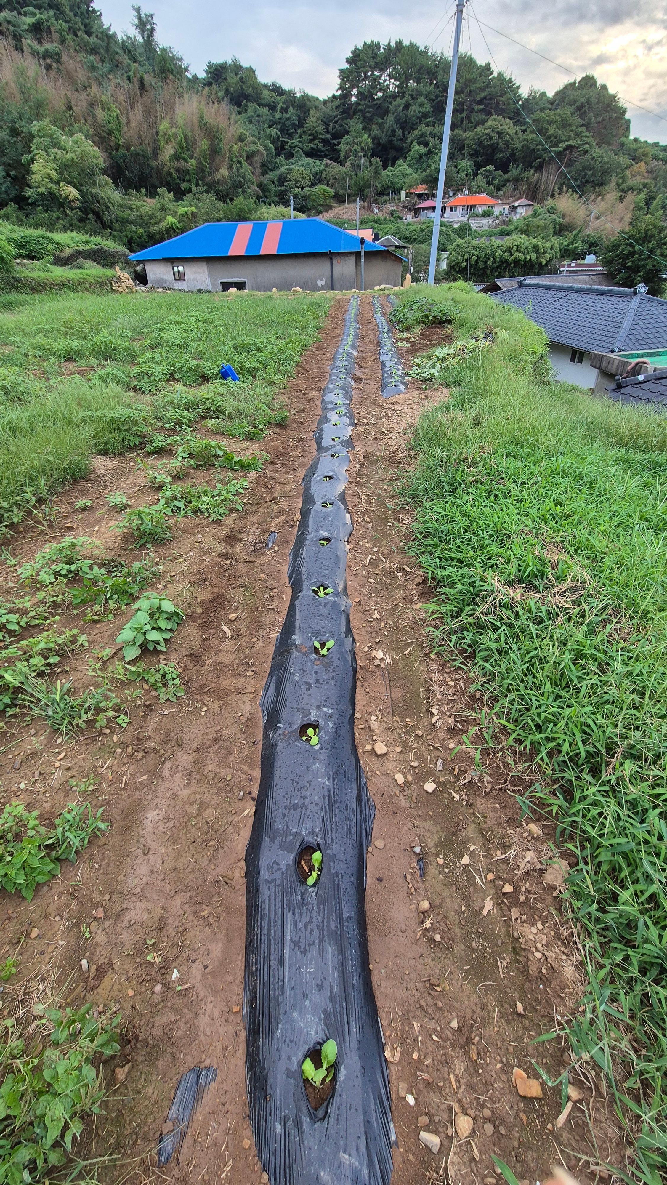 - 비가 내린 뒤라서 그런지 갑자기 아침이 서늘해졌다. 그래서 밭일을 서둘러야겠다는 생각이 갑자기 들었다. 기온에 예전보다 올라간 것도 감안하고, 이전을 생각했을 때 조금 늦게 심는 것이 좋을 것 같아 가능하면 늦게 심을 생각을 갖고 있었다. 그런데 이웃들에는 무뿐만 아니라 배추도 벌써 심은 집도 있어, 더 조급한 마음이 드는 것도 있다. 그래서 무를 심기로 했다. 며칠 전에 반 정도를 심었고, 오늘 나머지를 심은 것인데, 검은 비닐에 80개 정도의 구멍에 심은 것이다. 최근에 비도 왔고 또 주말 쯤에 비가 온다니 심고 나서 물 주는 수고는 덜었다.