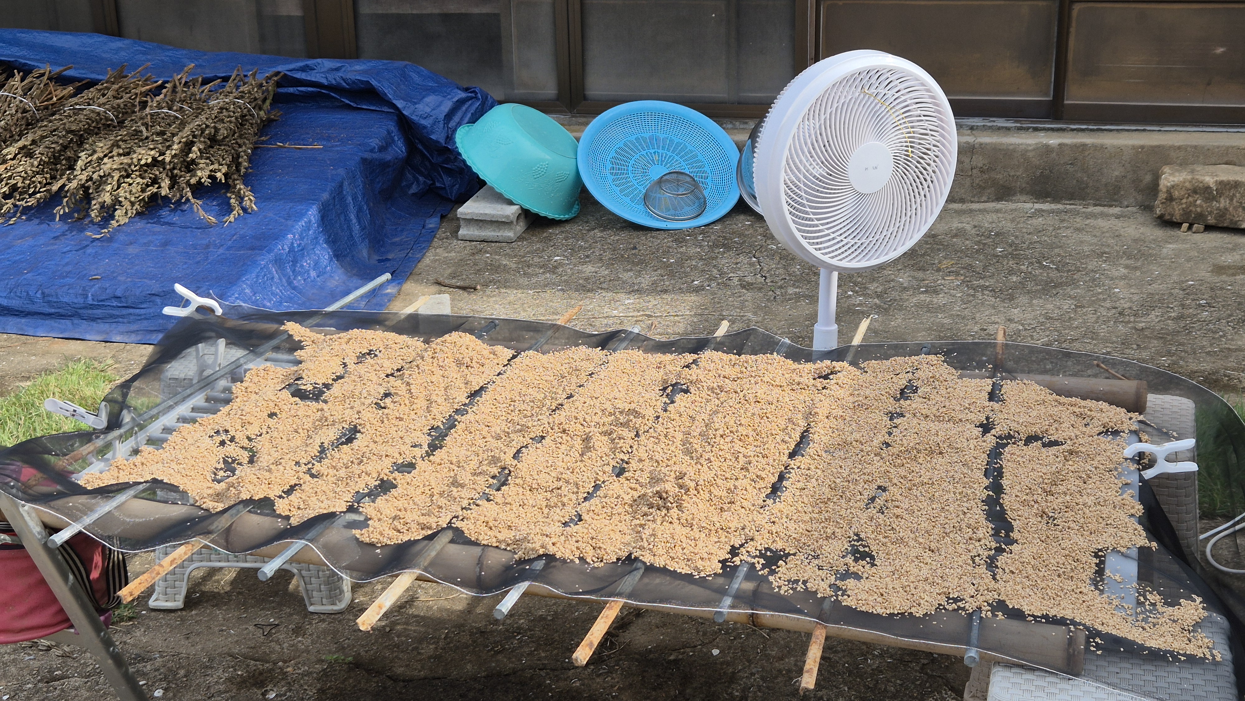 - 아침을 먹기 전에 어제 다 털은 들깨를 바람과 선풍기 등을 이용하여 이물질을 제거했다. 바람이 불 때는 바람으로, 바람이 불지 않을 때는 선풍기를 작동시키고, 마당에 철판 슬레이트를 깔고 큰 대야를 놓고 작업을 했다. 이루는 작업을 수차례 한 다음, 큰 대야에 들깨를 넣고 물을 부어서 휘휘 젓은 다음 들깨를 건져냈다. 이런 작업도 세 차례 정도 반복했다. 그리고는 철판 위에 미세 망사를 깔고 널어 놓았다.