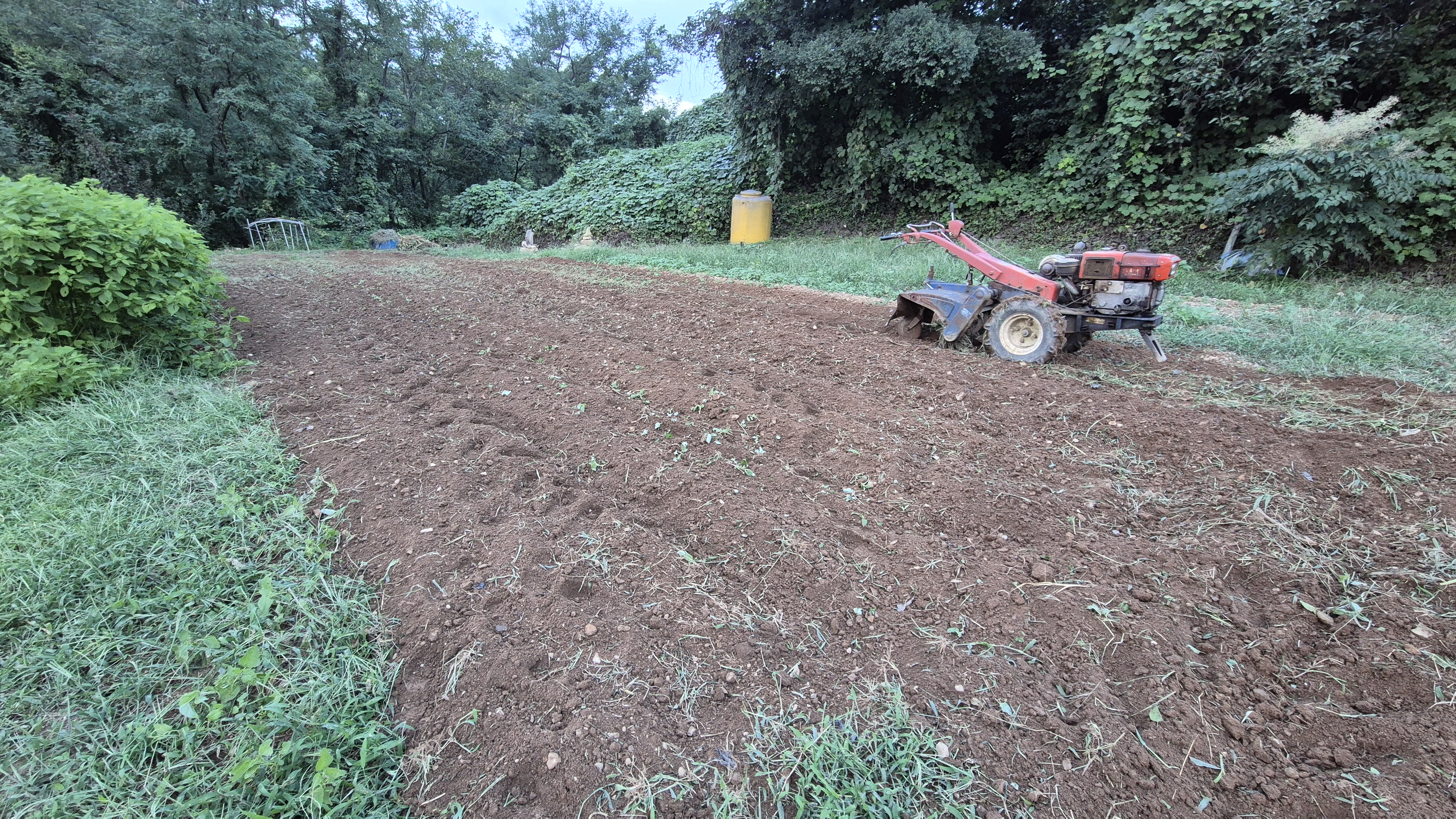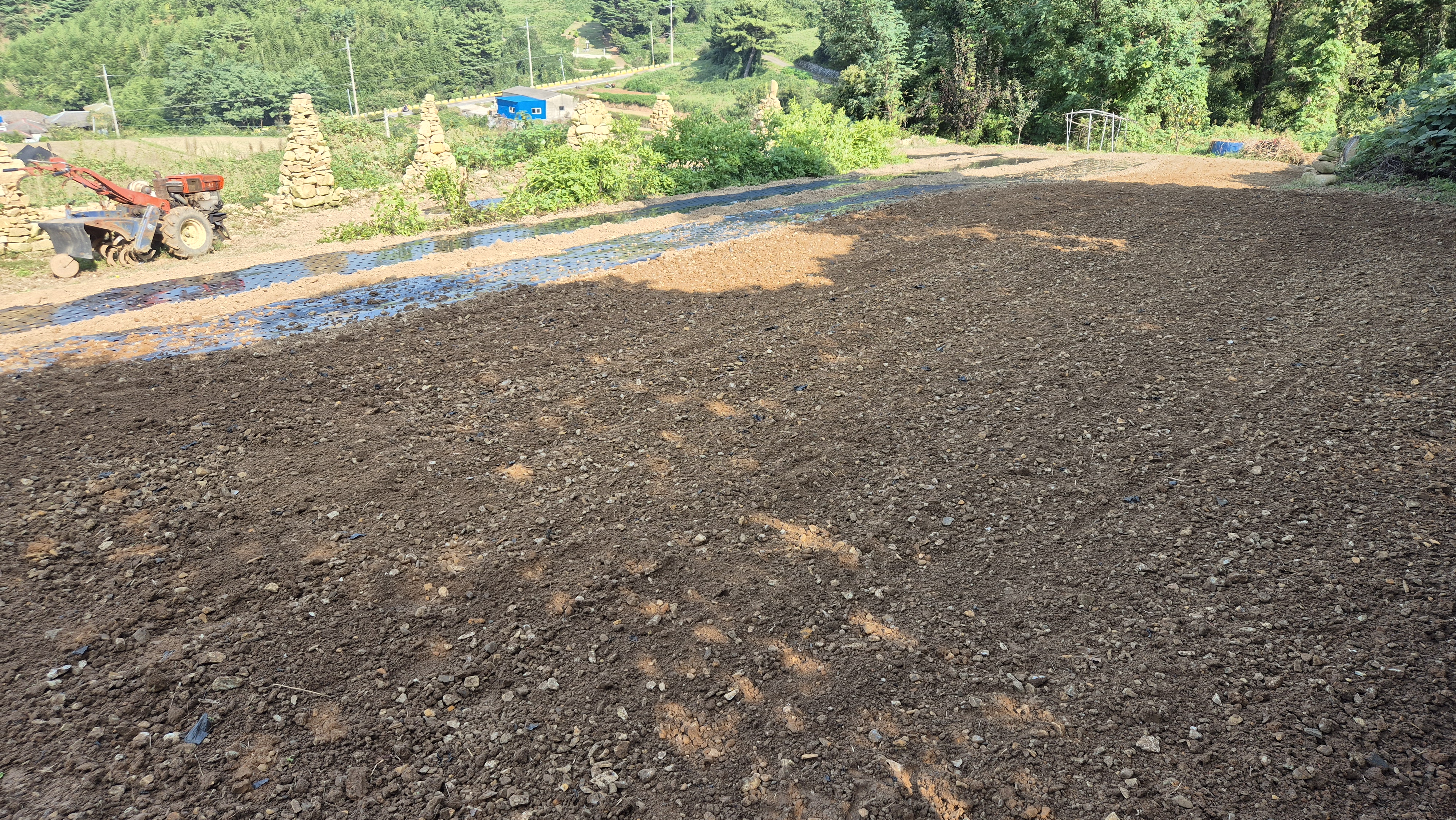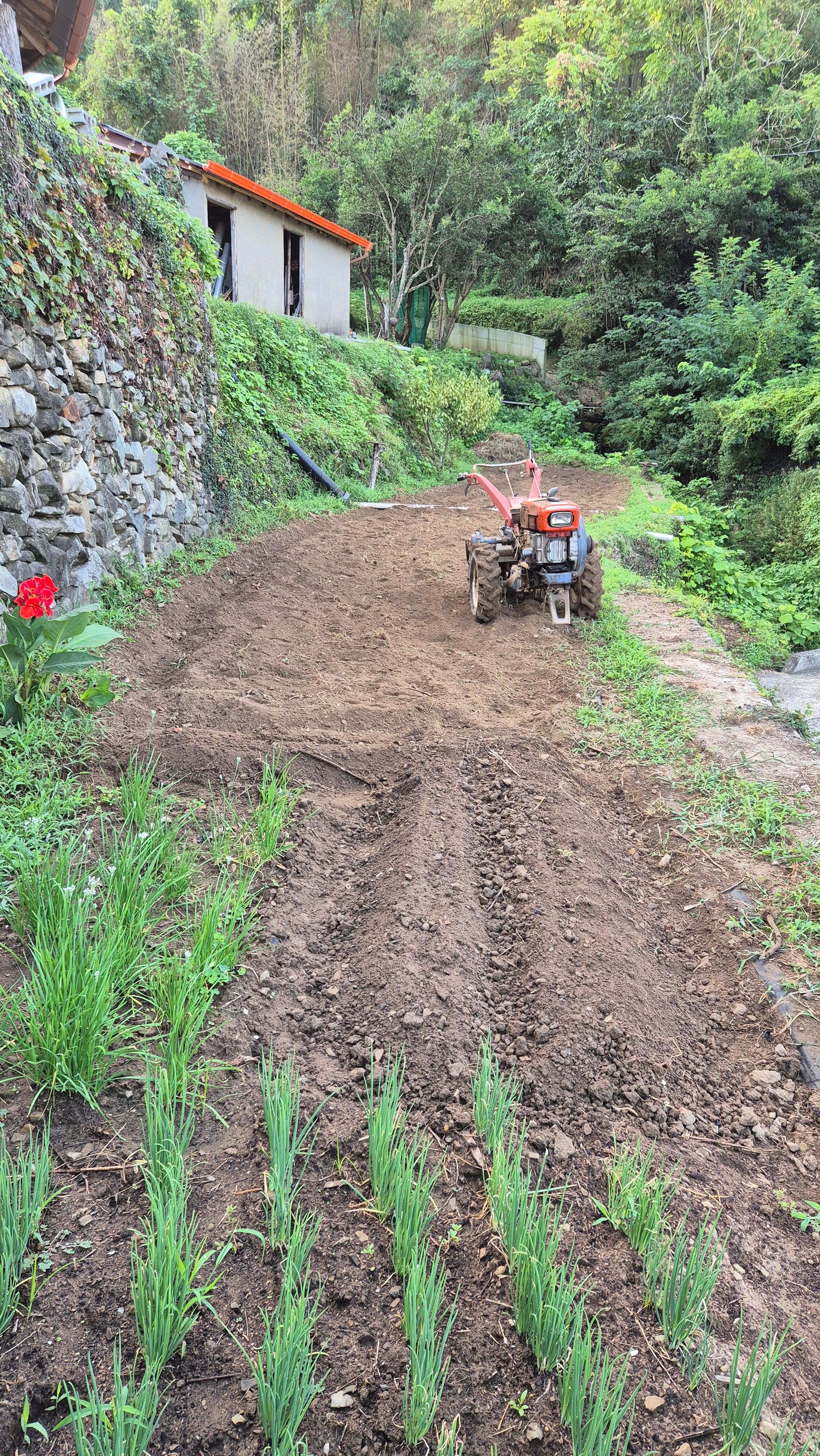 - 어제 저녁에 부산에서 오신 앞집 김사장님 내외가 새벽부터 일을 하고 계신다. 나도 일찍 채소밭 경운기 로터리 작업을 시작했다. 어제 참깨를 수확하고, 비닐을 걷어 낸 채소밭에는 이제 밭 앞쪽에 부추와 잔파, 또 어제 심은 당근밭이 조금 있다. 나머지는 다 빈 상태다. 봄에 고추도 심었고, 오이 등 각종 채소를 심었던 곳이다. 당장 전체적으로 로터리 작업을 할 이유는 없지만 풀을 죽이기 위한 작업이다. 이달 말쯤 이곳에 시금치도 좀 심고, 또 양파도 좀 심을 생각을 하고 있다.