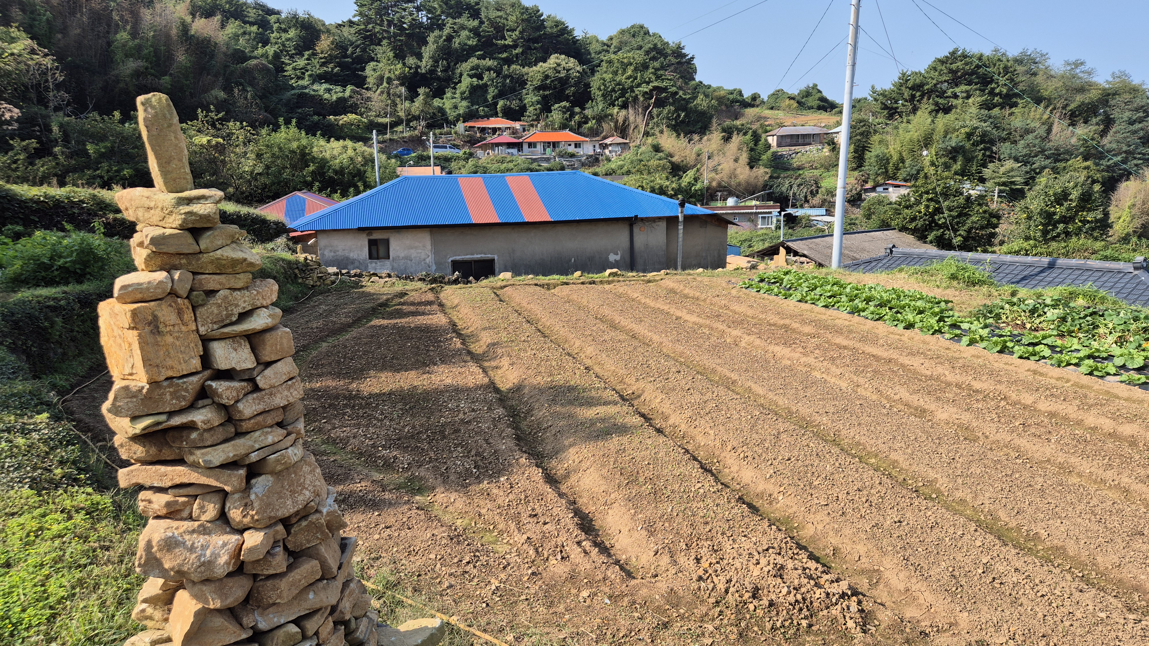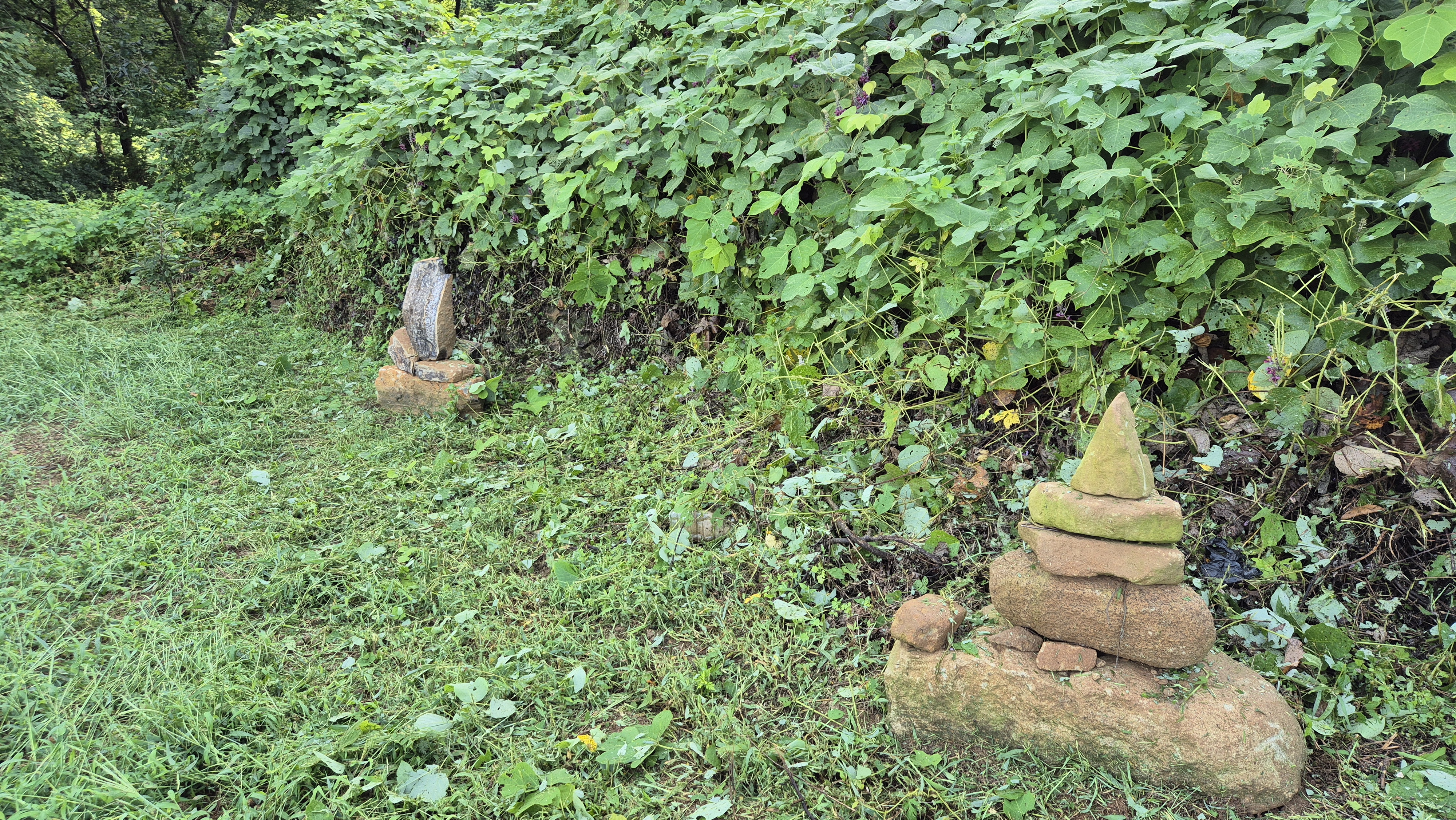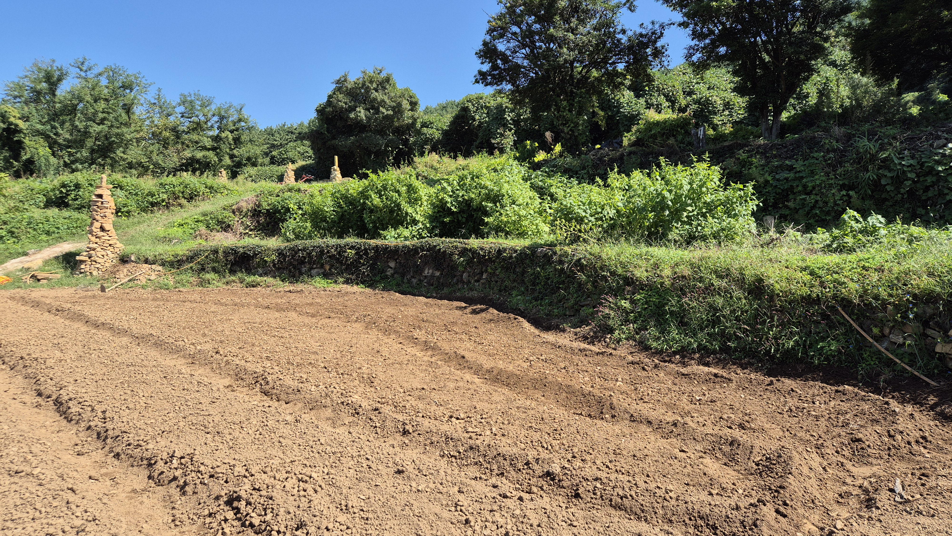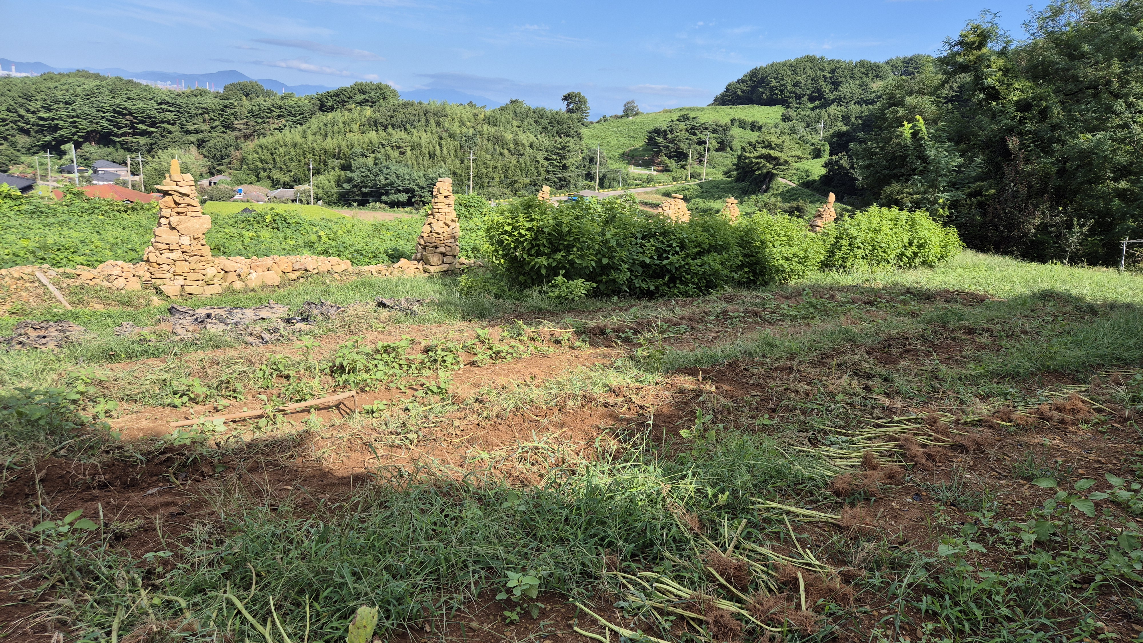 - 그곳에 예초기를 돌리면 예초기 잔해들이 지붕 위에 날려서 엉망이 된다. 그렇게 발생한 지붕 위 풀 쓰레기들은 강한 바람이 불거나 비가 오면 처마 밑으로 떨어지거나 날려 버린다. 오늘도 지붕 위에는 풀 잔해들이 엉망이다. 뒷 밭 가장자리도 작업을 했다. 경운기 로터리 작업으로 해결되지 않는 부분들을 위주로 작업을 했다. 그렇게 작업을 하면 그래도 돌탑들이 제대로 드러난다.