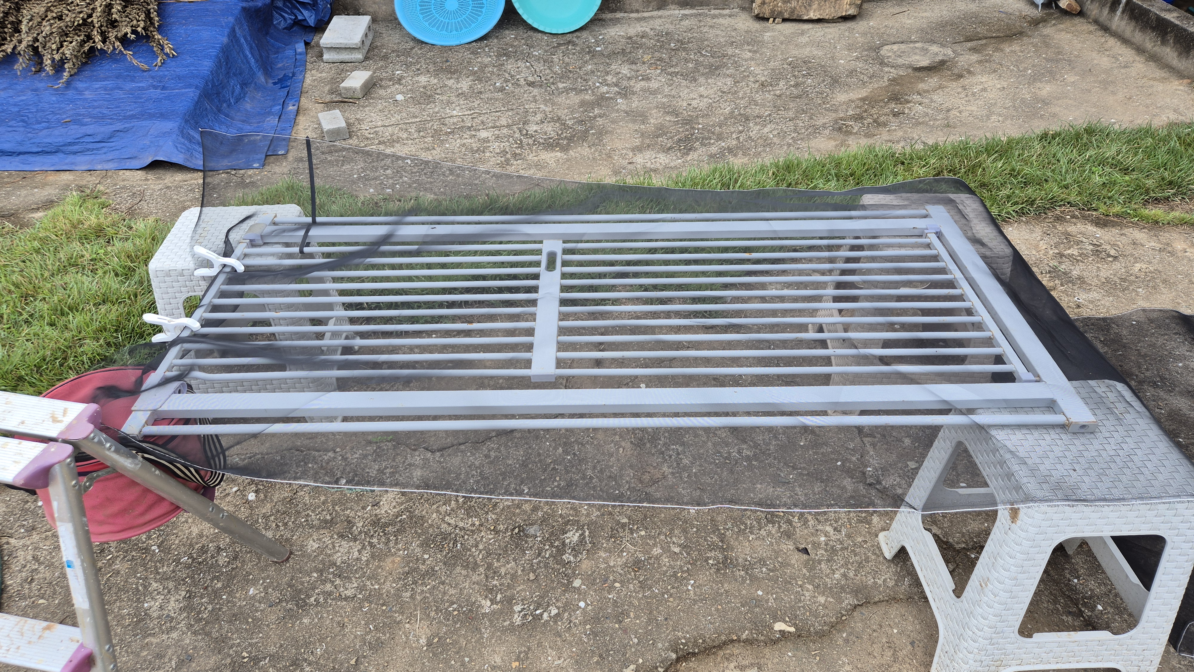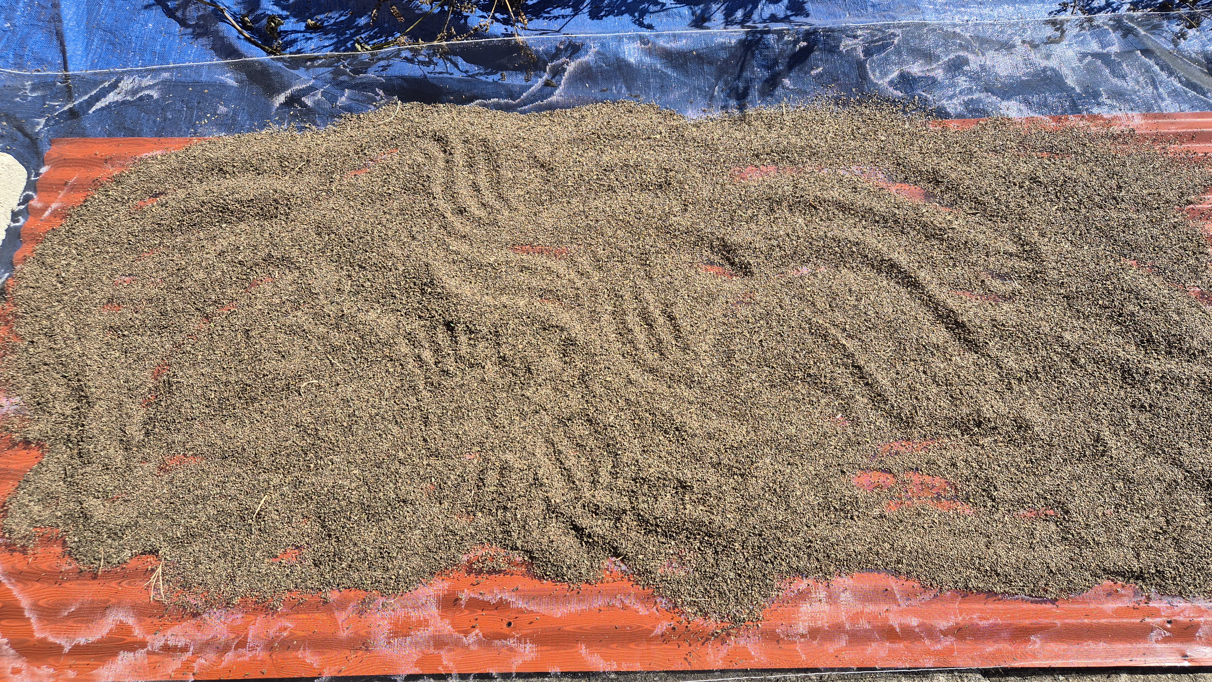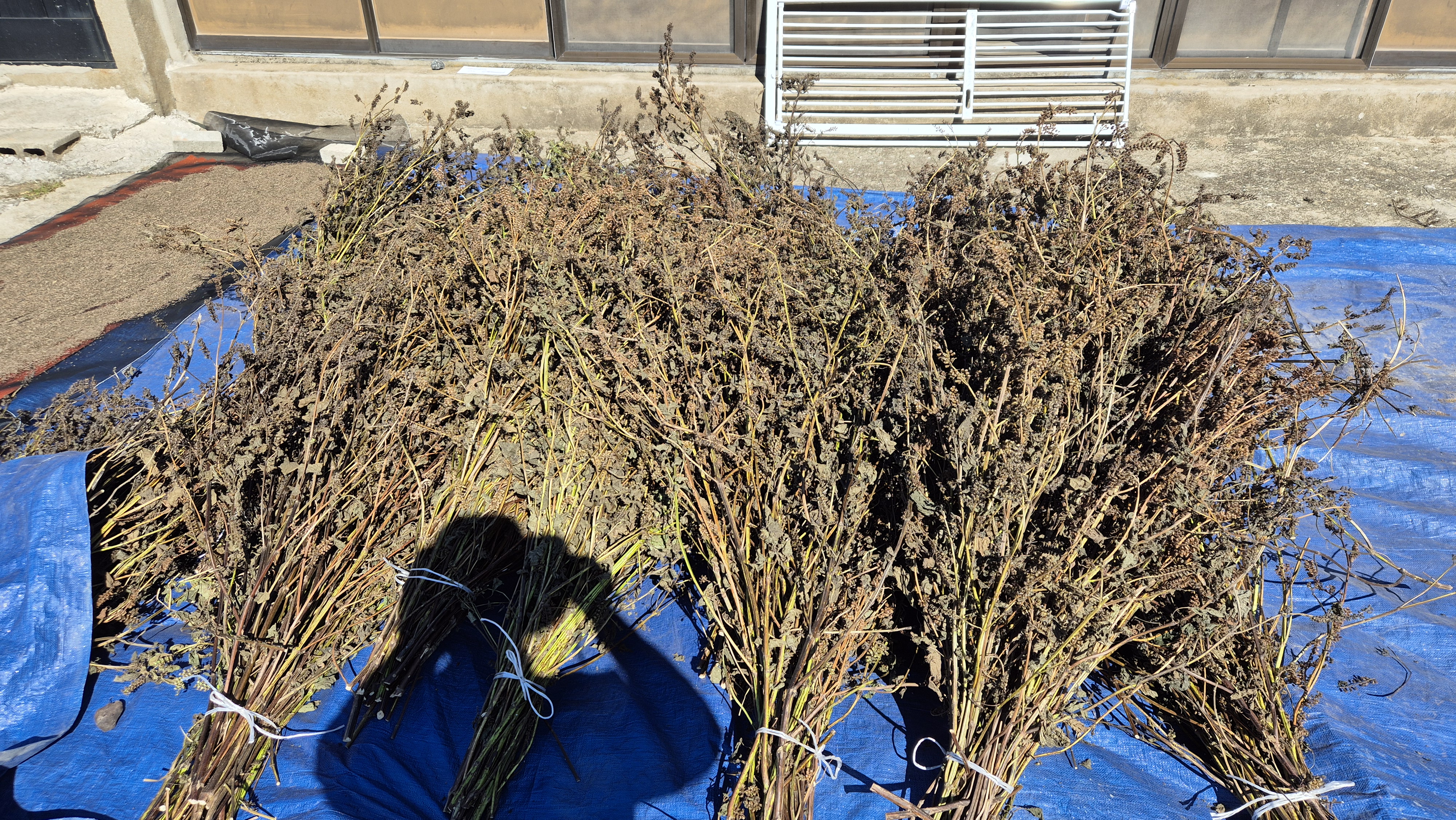 - 바닥에 부직포를 깔고 긴 각목을 걸쳐 그 위에 참깨를 널어 놓았다. 아직 다 수확한 상태는 아니지만 지금까지 수확한 것들을 전부 이곳으로 옮겼다. 각목을 세 단으로 설치해 널었는데, 얼마 전에 창고 지붕을 할 때 구입해 놓았던 각목이 톡톡한 역할을 했다. 날씨가 좋아지면 밖으로 꺼내기도 훨씬 쉬울 듯하다.